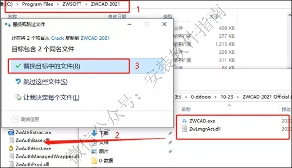 5、接着将小编提供的中望cad2021破解文件复制到软件根目录下,并进行替换;【默认安装路径C:\Program Files\ZWSOFT\ZWCAD 2021】