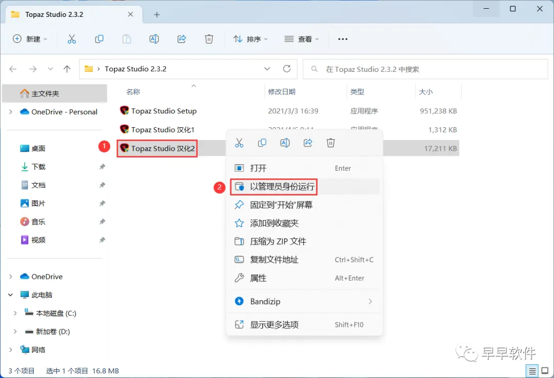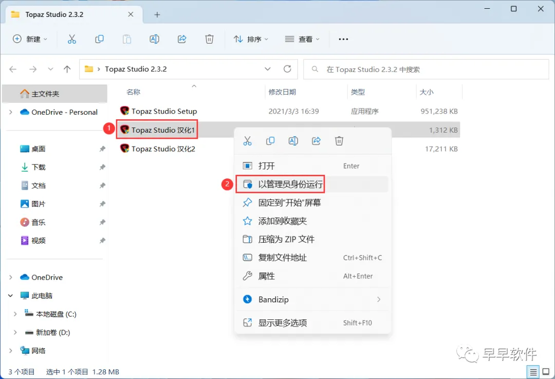 10、回到Topaz Studio 2.3.2文件夹,找到并选中【Topaz Studio 汉化1】程序,右键选择【以管理员身份运行】它