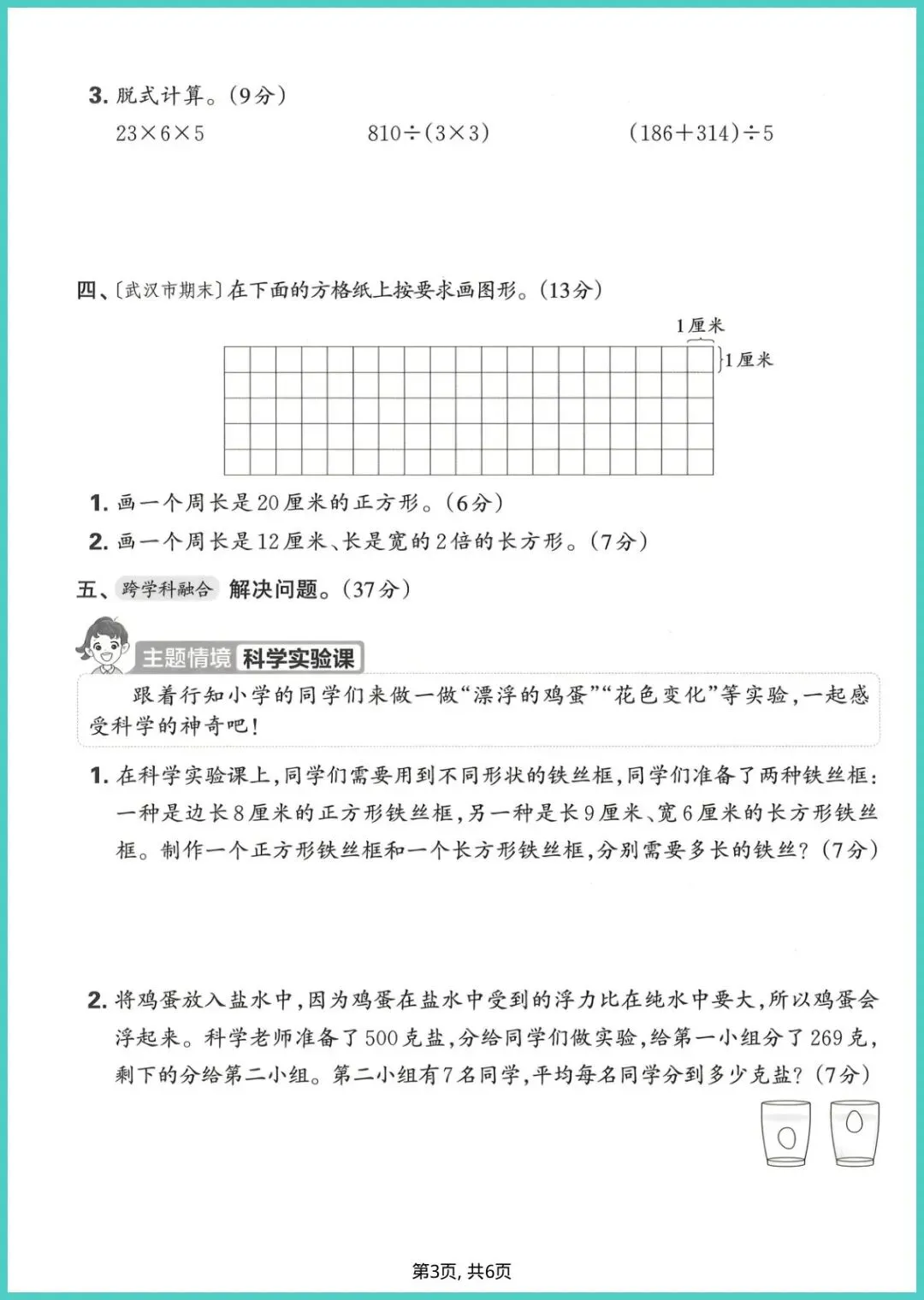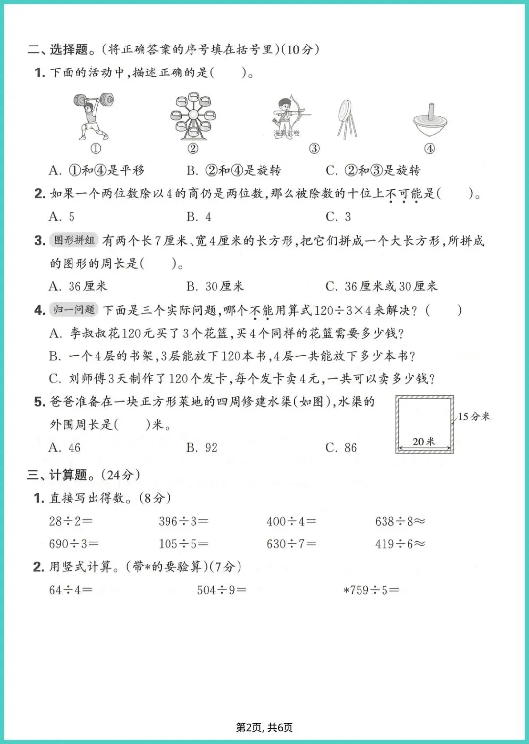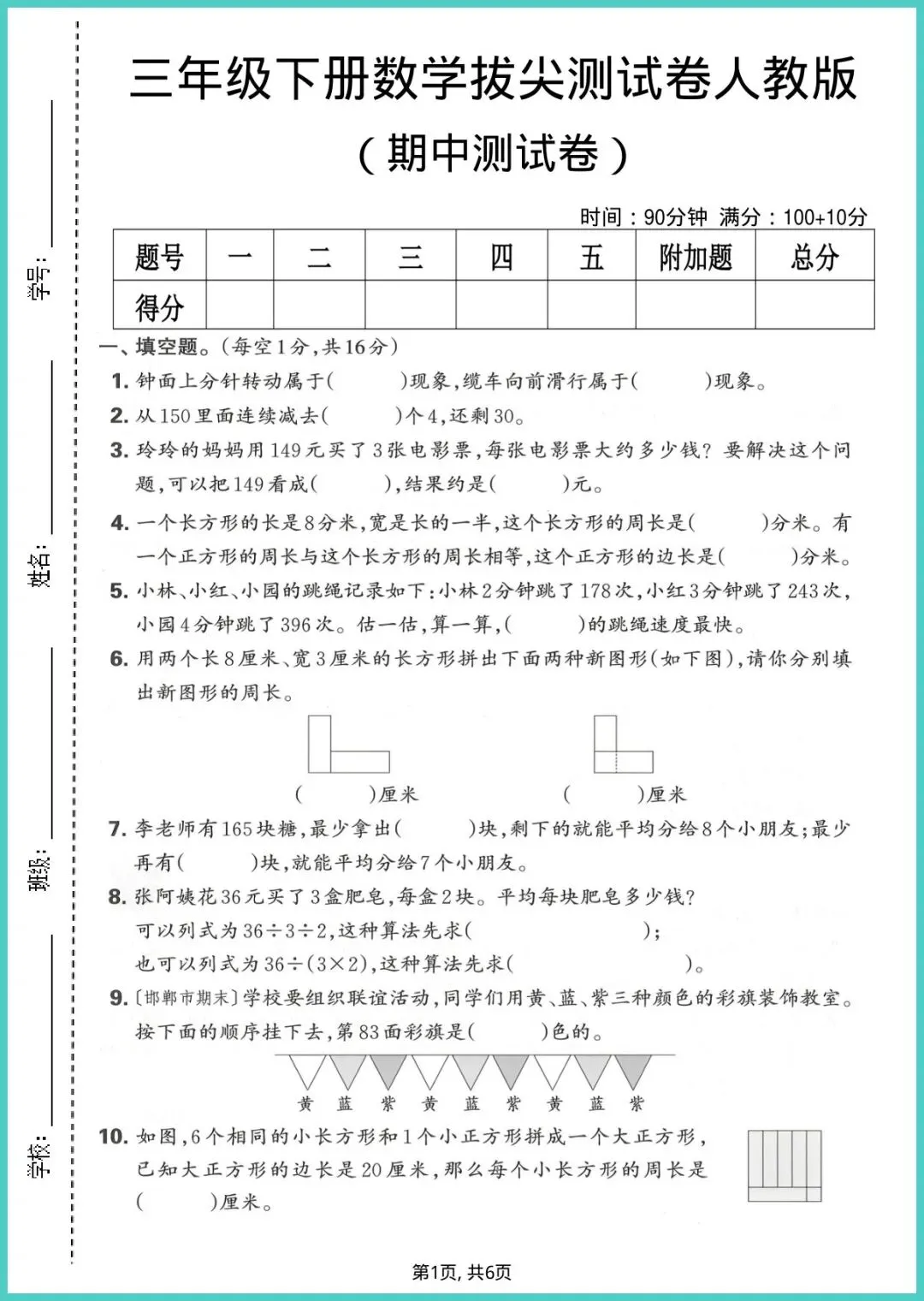 2026春人教版三年级(下)数学期中拔尖测试卷2新鲜出炉!6页精编,电子版一键可打。卷内分“计算小达人”“思维大闯关”“易错回头看”三大模块,把期中必考点、易错点、压轴题一网打尽;每题配星级难度与思路提示,让孩子先稳基础再冲满分。每天15分钟,练速度、练思维、练细心,期中高分水到渠成!想抢先拔头的家长,现在就打印,娃今晚就能练起来!