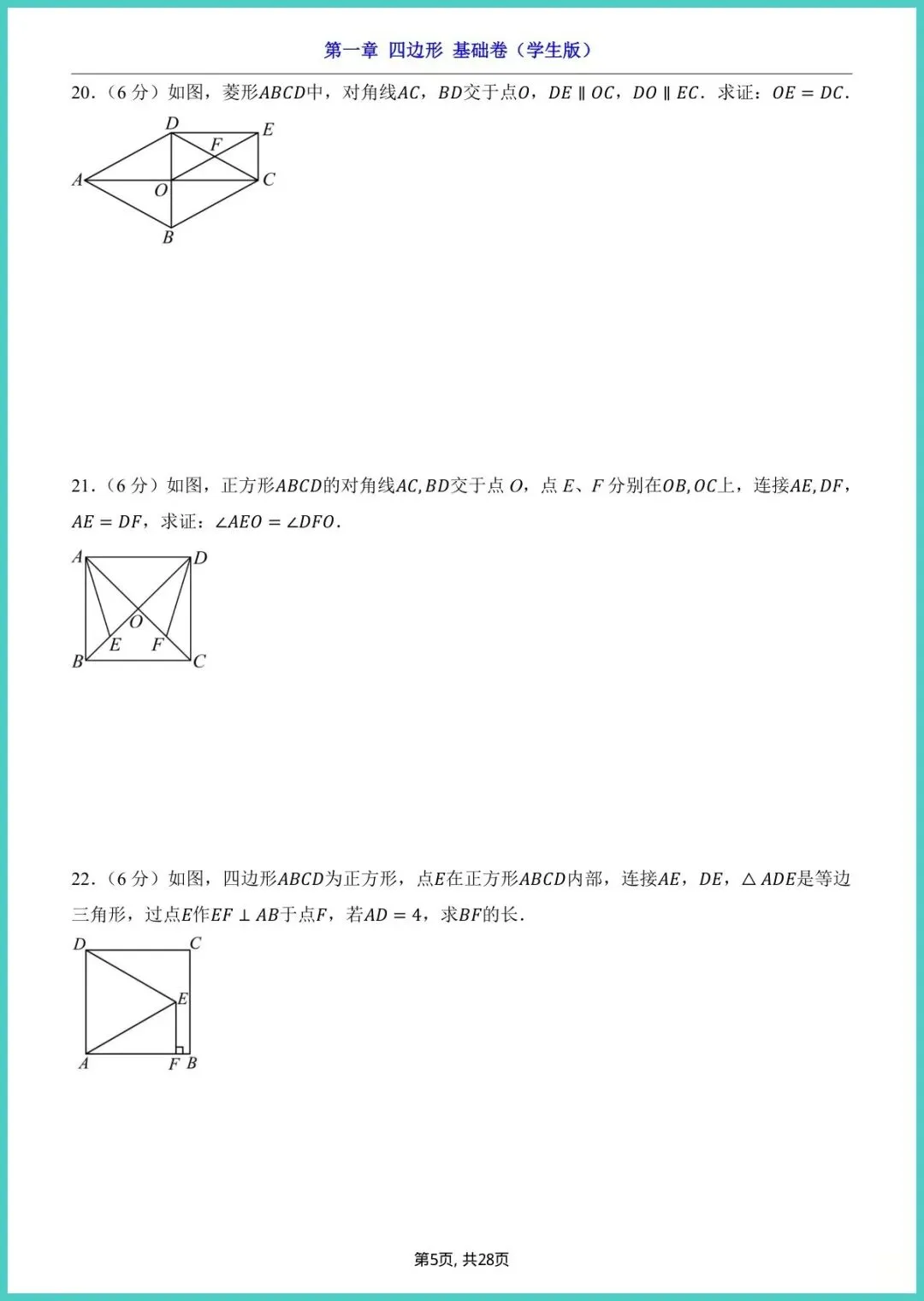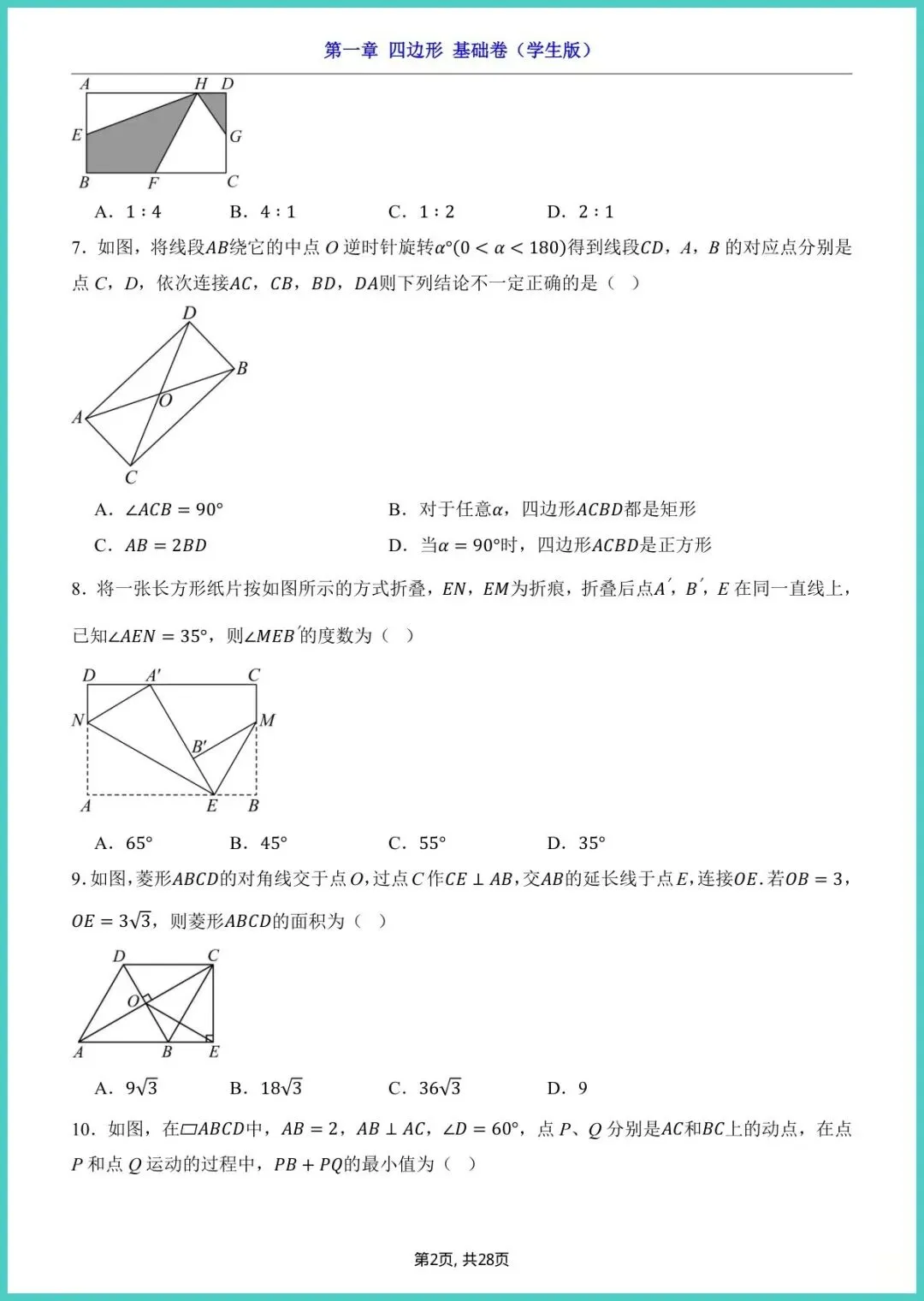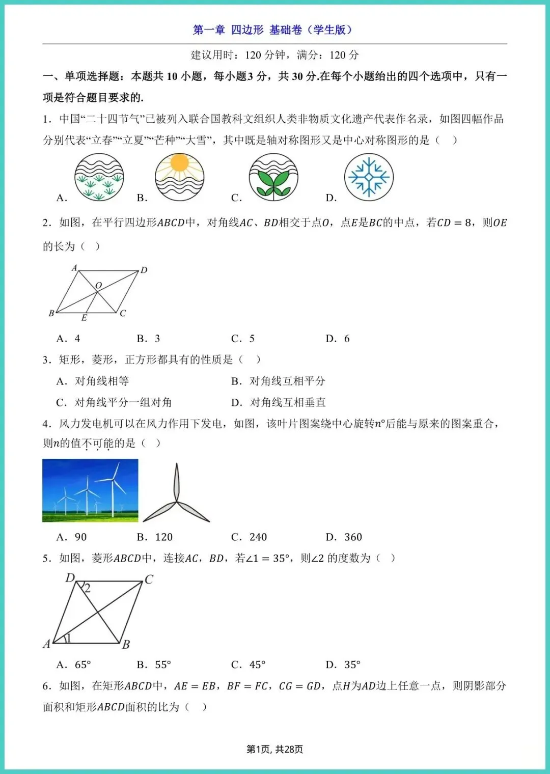 2025年春湘教版八年级下册数学第1章《四边形》基础卷,28页电子版一次打包!这份小卷把平行四边形、矩形、菱形、正方形、梯形所有性质与判定一网打尽:课前填空→课中例题→课后分层练→易错警示→答案详解,五步闭环,孩子写完就能秒懂“对角线互相平分”到底怎么考。每天10分钟,图形不再抽象,证明不再跳步,期中稳拿几何大题基础分!想让孩子不再怕四边形、家长不再陪到深夜的,现在就打印,练起来!