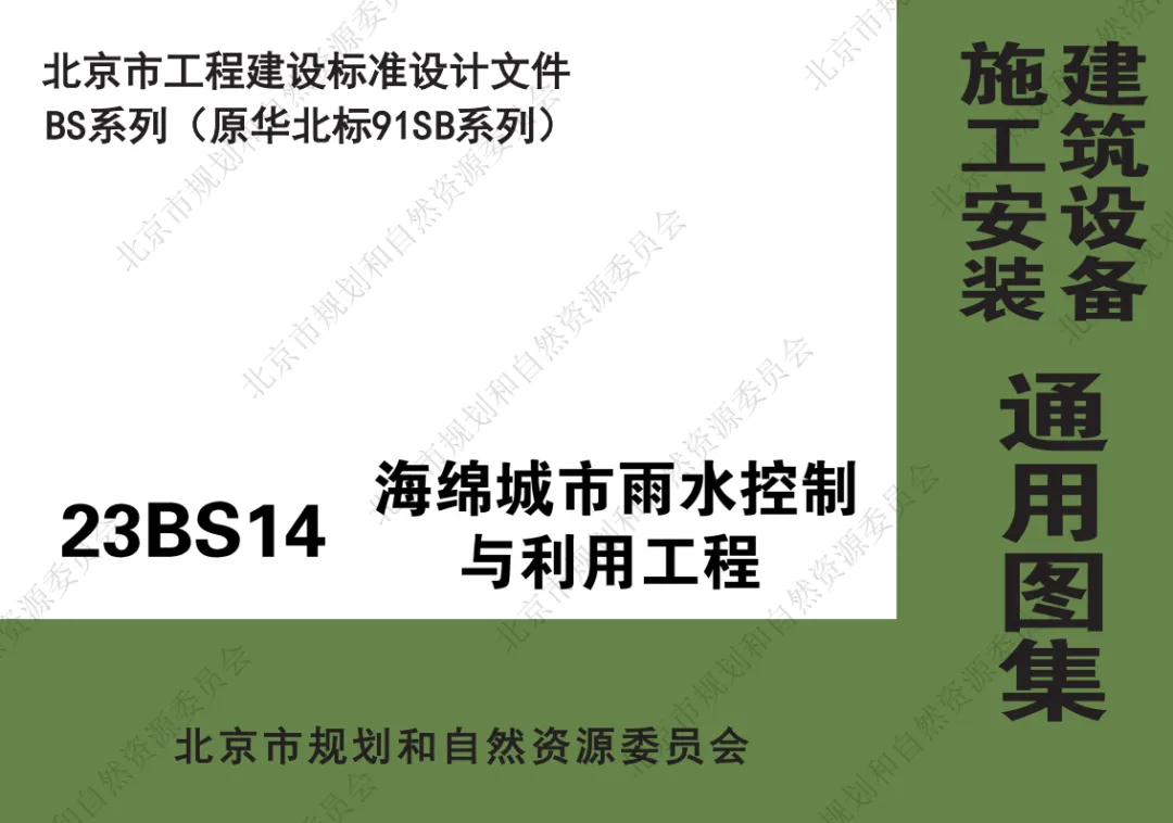 23BS14 北京市通用图集《海绵城市雨水控制与利用工程》 23BS14 是北京市官方通用图集,用于指导北京地区新建、改建、扩建项目的海绵城市设计、施工与验收,统一技术做法与节点详图,实现渗、滞、蓄、净、用、排一体化雨水管控。