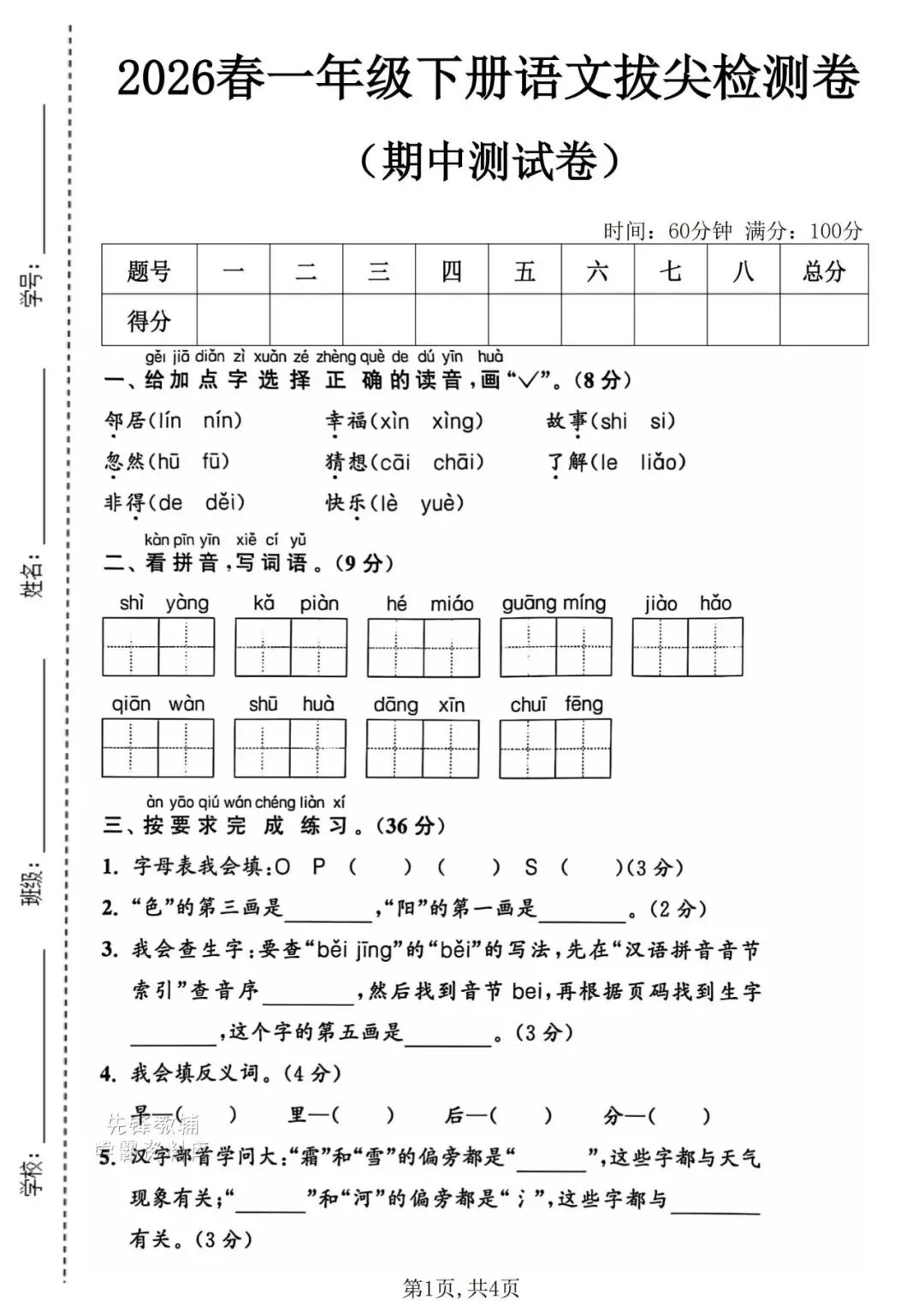 「26春1~6年级下语文第一单元测试卷5套(含答案)」