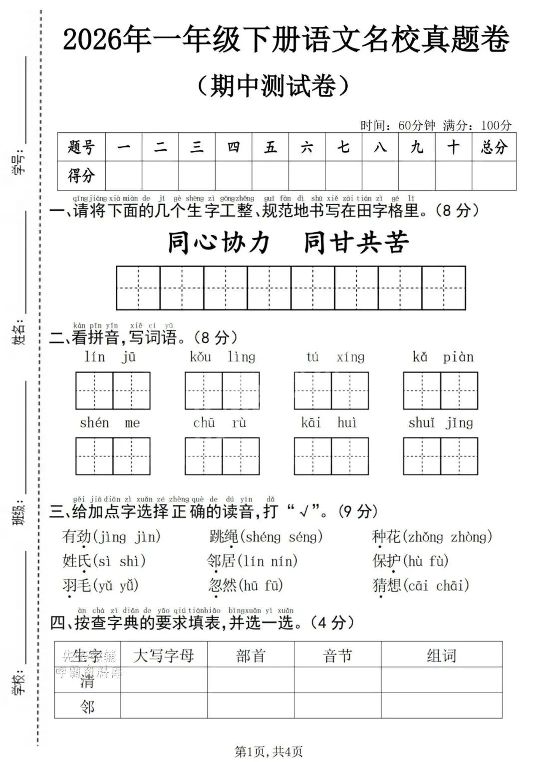 26春《一下语文期中测试卷5套》