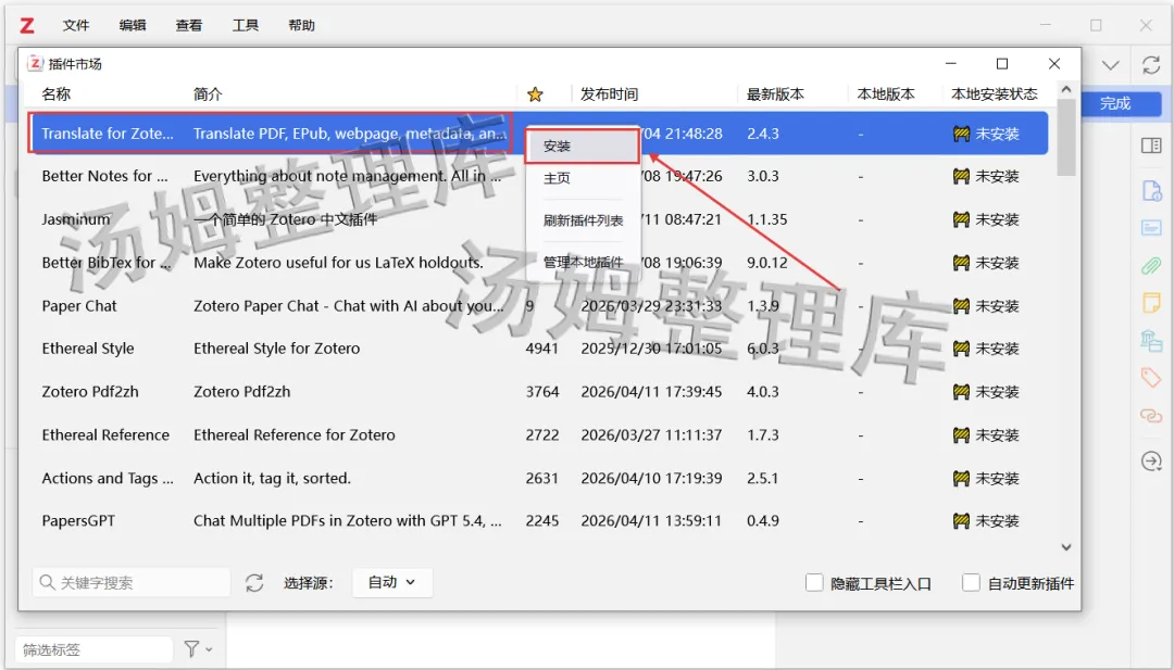 1.打开Zotero软件主界面,点击上方菜单栏的【工具】展开后,点击【插件】。2.先点击【小齿轮】展开,然后选择【Install Plugin...】。3.到刚解压的Zotero 9.0安装文件夹,打开【插件市场】文件夹,选择里面的【zoter-addons】然后点击【打开】。5.回到Zotero软件主界面,点击【工具】展开后,点击【插件市场】。6.打开会有很多插件可以选择安装,方法非常简单,例如安装翻译插件:找到【Translate for。。。】插件,选中后右键点击【安装】。7.翻译插件就会自动下载安装,后面显示【已安装】绿色打勾就是成功了。8.在Zotero软件界面上方【编辑】展开点击【设置】。9.点击【翻译】鼠标滚动或下拉,找到【服务】选择对应的翻译服务即可。1.安装提供的所有下载文件均是网络收集,请于下载后的24小时内删除。如需体验更多乐趣,请支持正版。2.我们提供用户下载的所有内容均来自互联网。如有内容侵犯您的版权或其他利益的,请联系我们会在收到消息后24小时内处理。