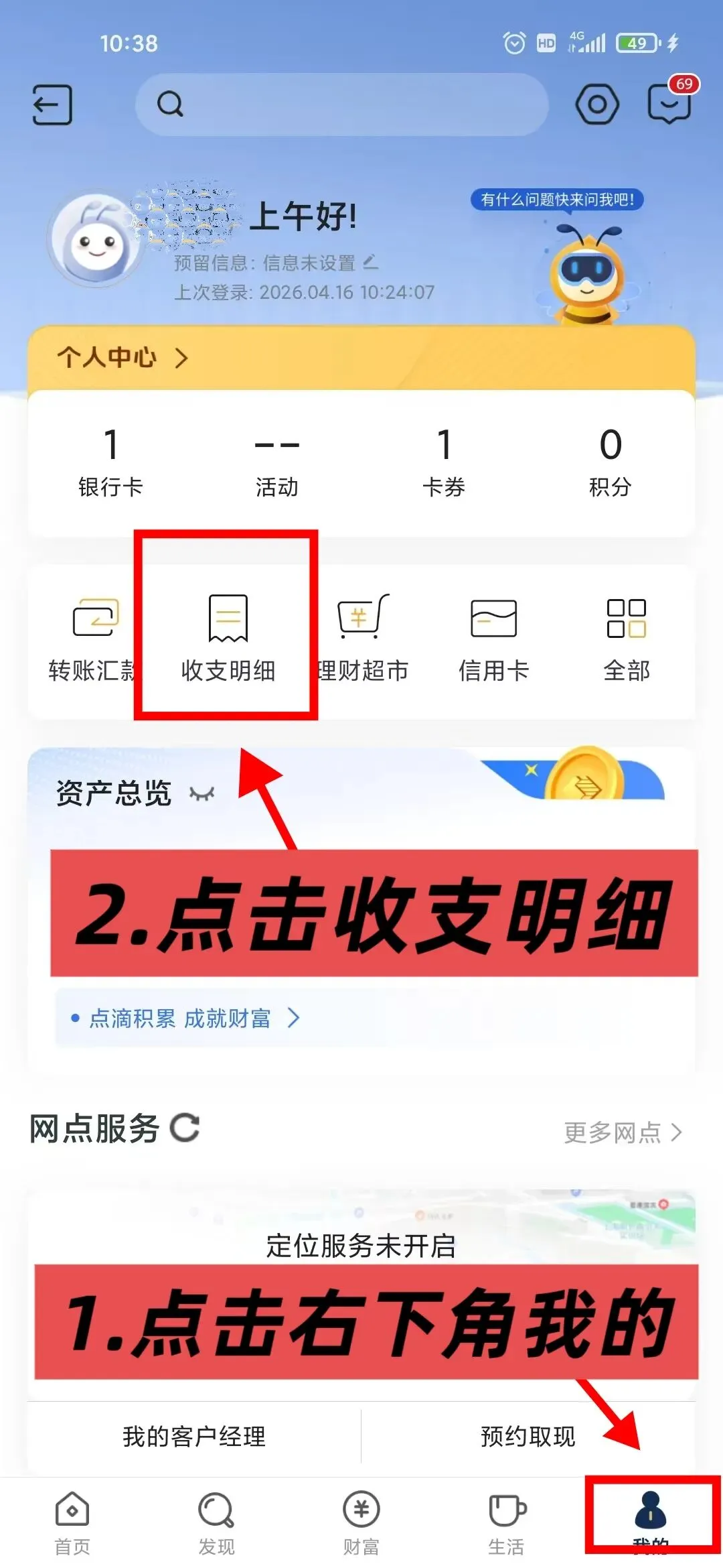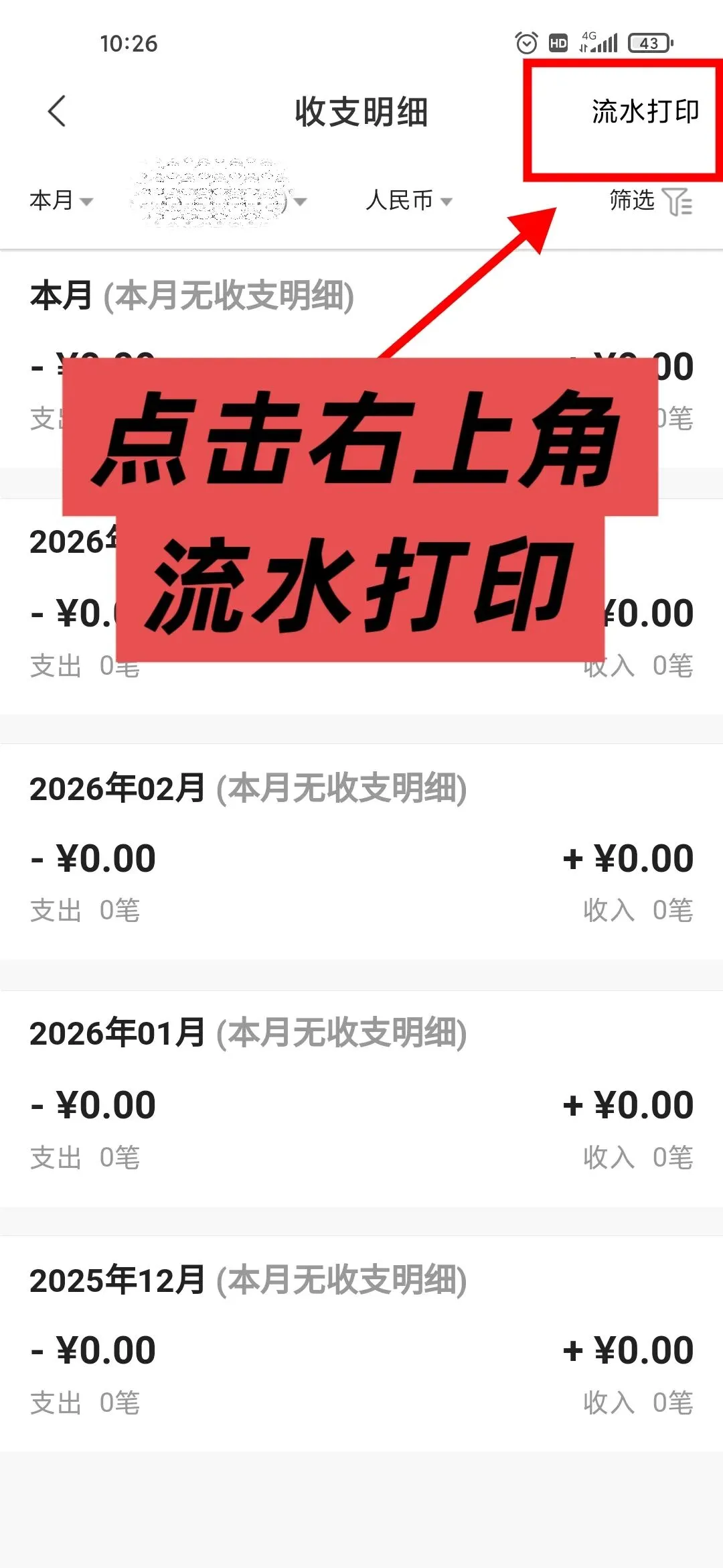 收支明细打开后你会看到你的近期流水界面,在这个界面的最右上角点击流水打印字样。字比较小,如图:
