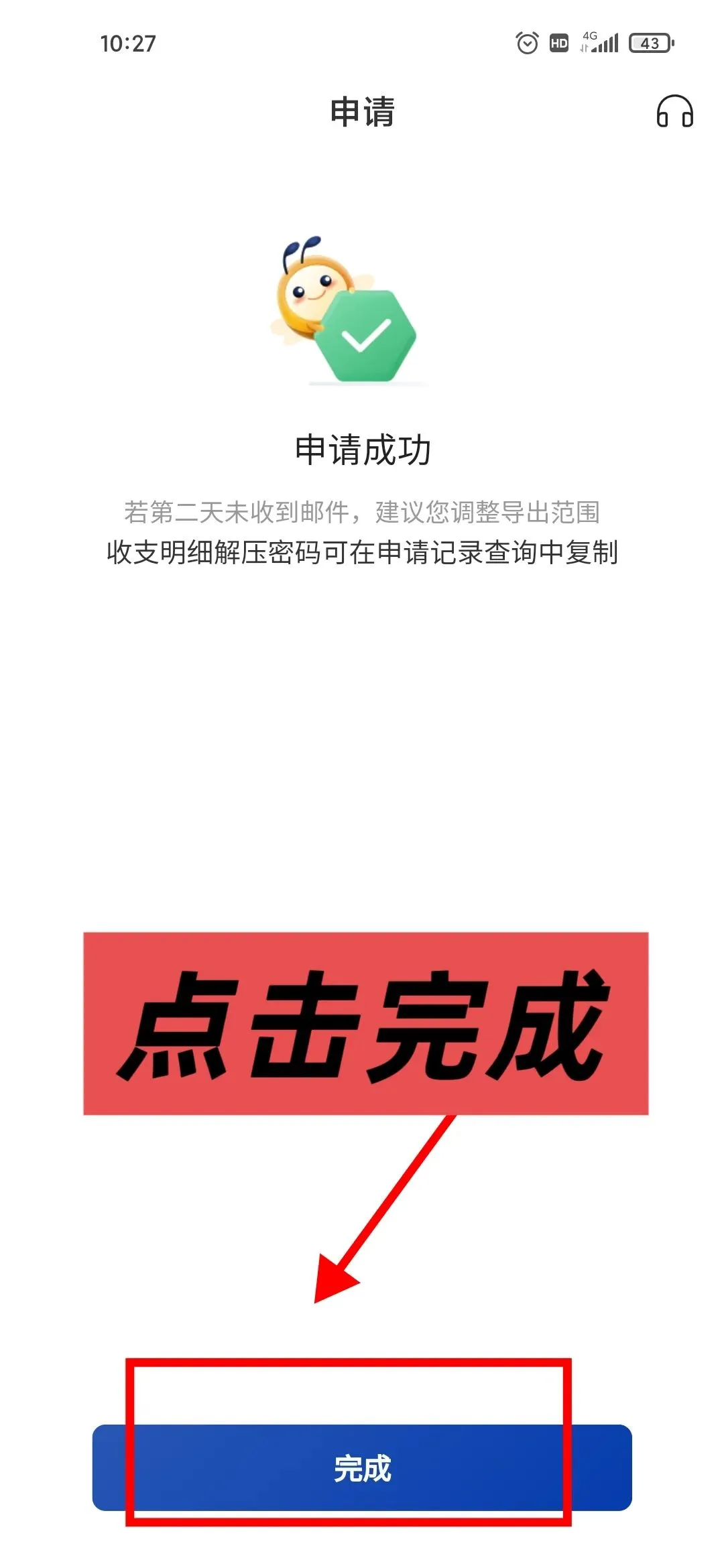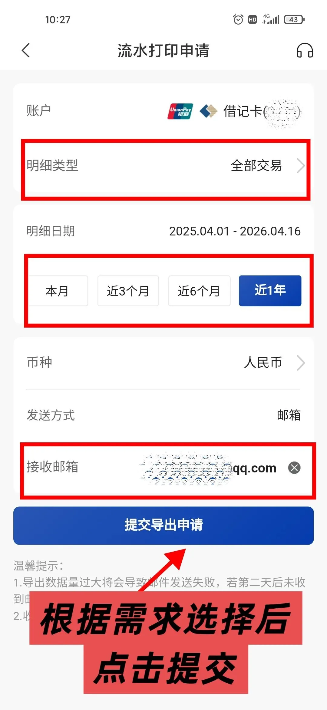 下一个界面就是让你选择你的卡号,打印的时间等,填上邮箱,核对无误后点击蓝色提交导出申请选项。