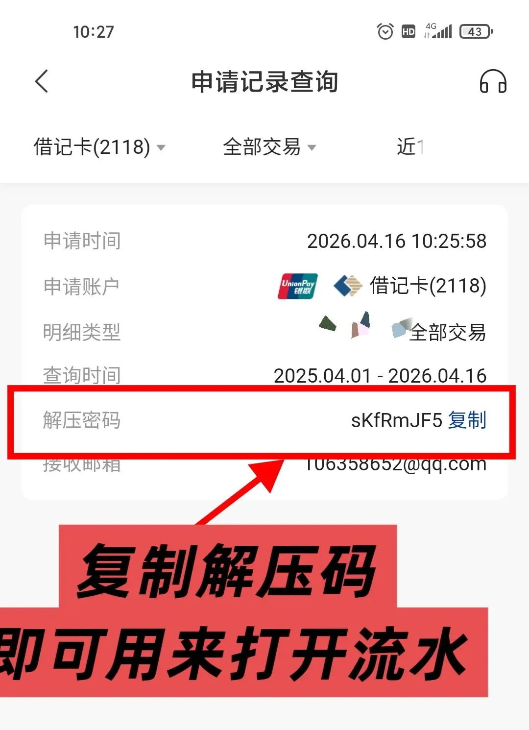 点击申请记录后,进入界面复制你的解压码,就可以在邮箱打开你的流水啦,是不是很简单呢?快去试试吧!