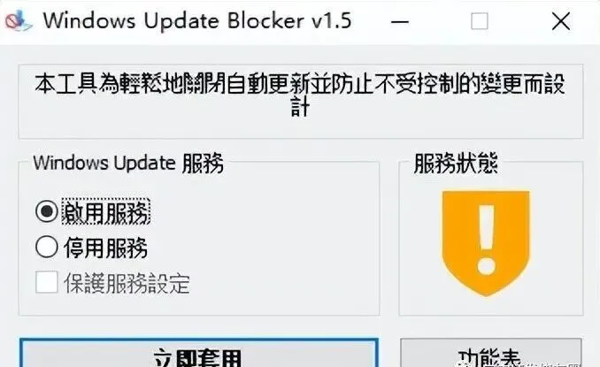 这是一款能够一键关闭win10自动更新的工具,能够一键关闭或开启win10的自动更新设置,能够避免因系统更新带来的困扰,系统不会再自动更新。