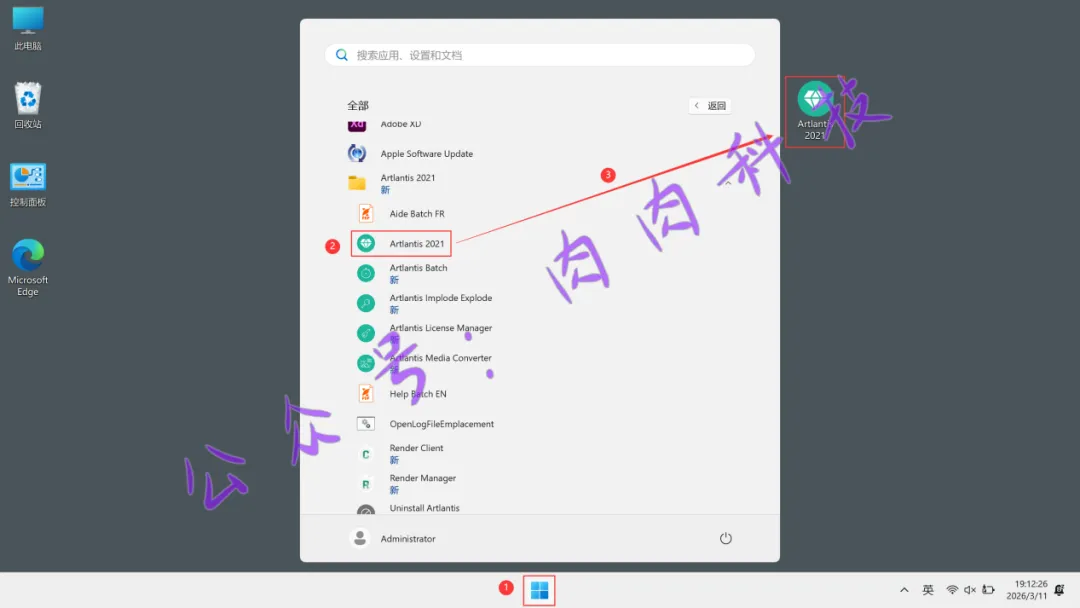 14.回到电脑桌面上,点击【Windows徽标】,找到【Artlantis 2021图标】,并长按鼠标左键将软件图标放置到桌面,完成Artlantis 2021软件快捷方式的创建