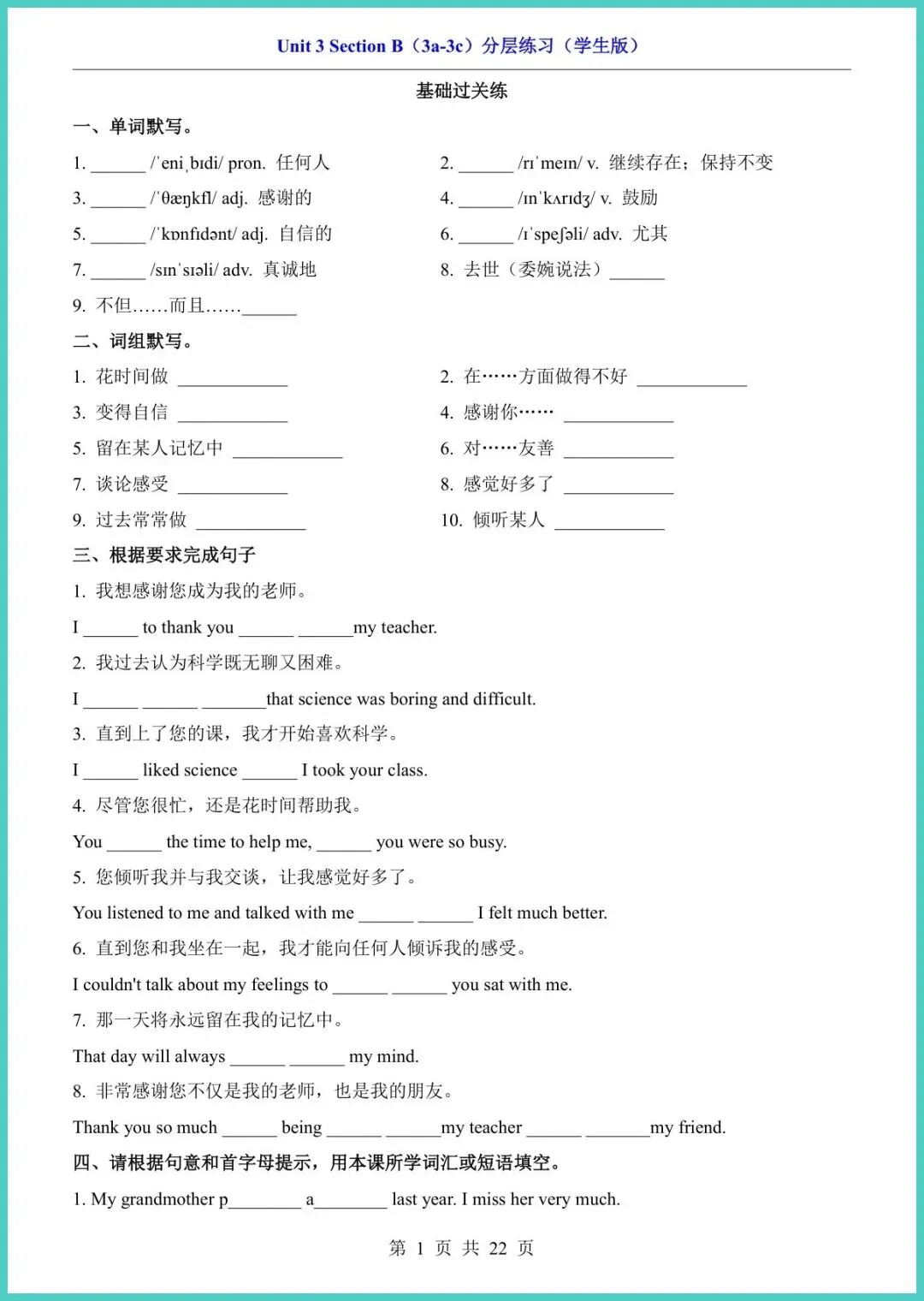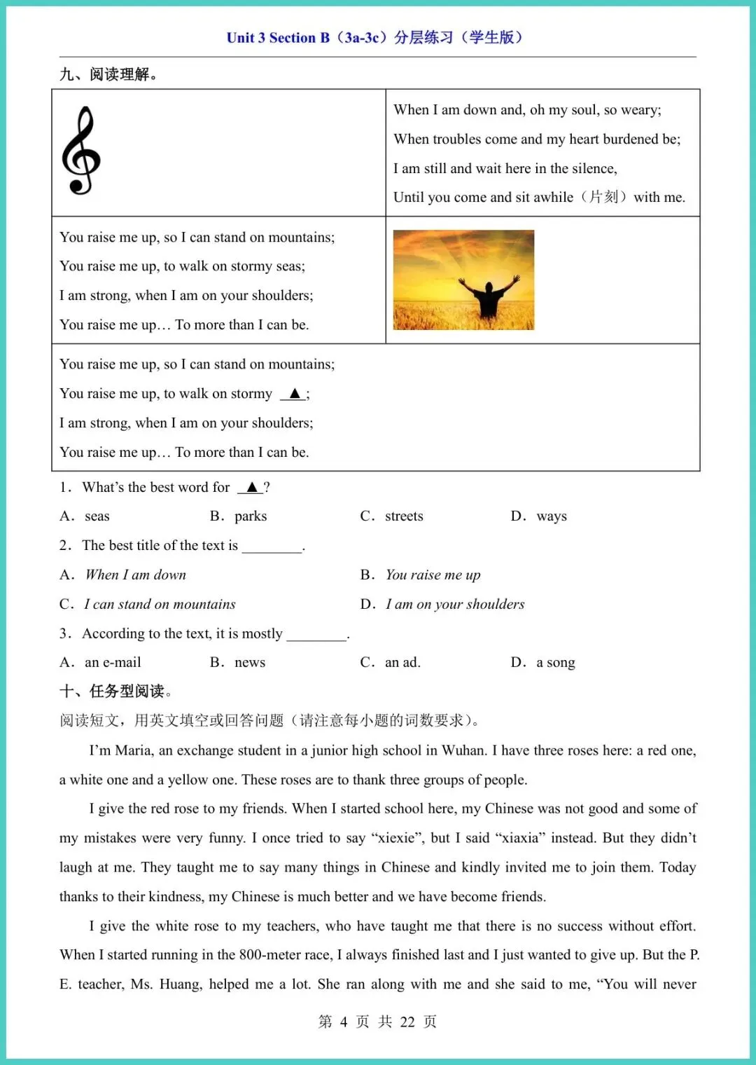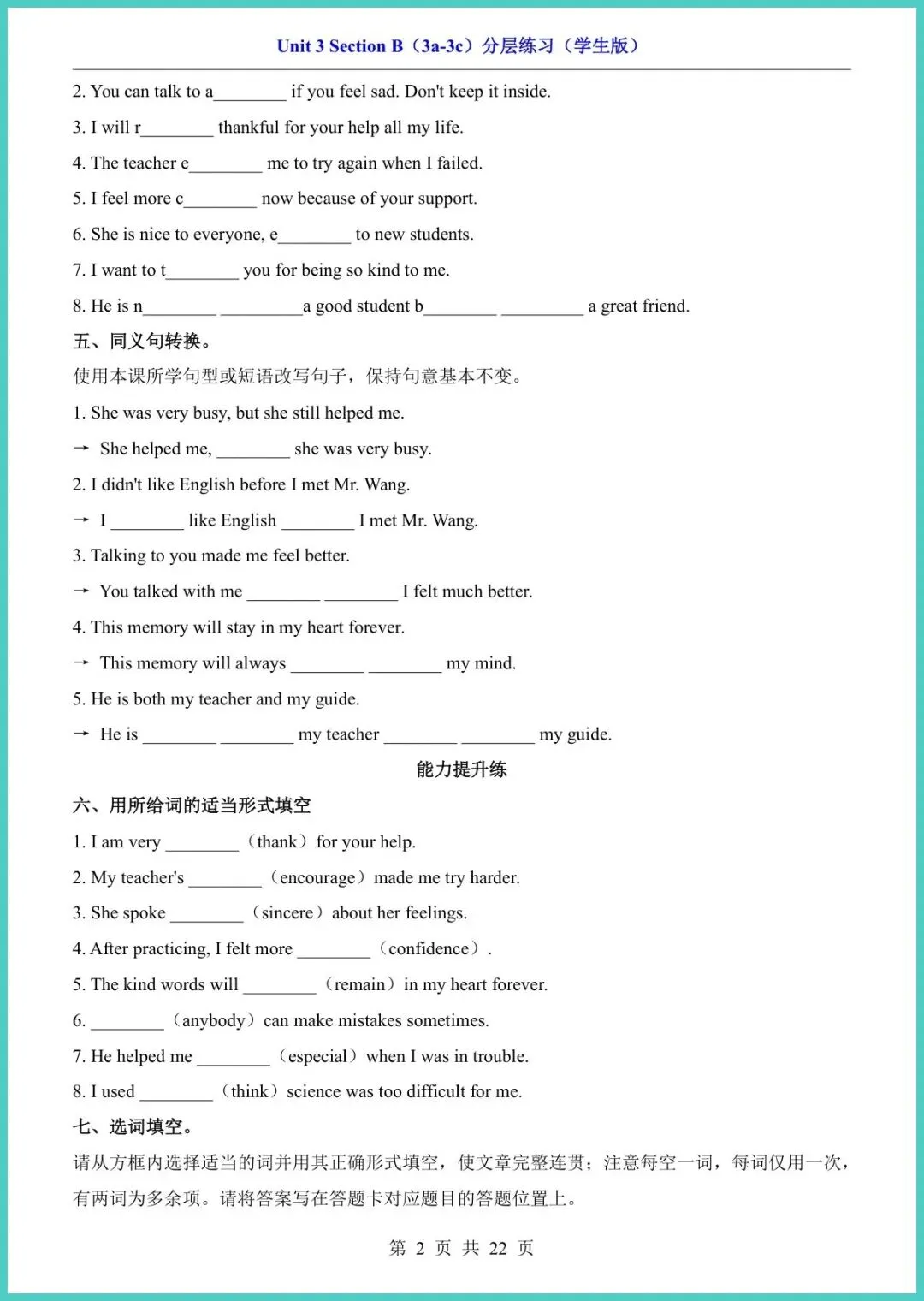 2025春人教版八年级下册英语Unit3 Section B(3a-3c)分层练习,22页精编电子版,一键可打印!这份资料把“基础巩固—能力提升—拓展拔高”三级梯度一次打包:词汇变形、句型转换、阅读策略、写作模板全配典型例题,左栏讲技巧,右栏即练即评,孩子10分钟就能摸清短板,20分钟就能看见提分。期末想冲刺110,先把这22页啃透!需要的家长现在就去打印,今晚就让孩子练起来!