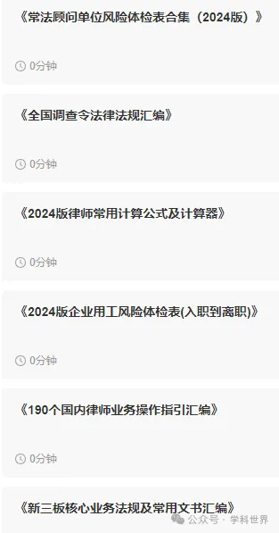 379:公司内控风险点、控制点、控制措施框架和具体实施标准参照体系380:尽职调查清单(私募基金/详细版)(word/pdf版)381:企业合规业务的七大必备工具382:公司并购全流程实务操作指引383:劳动仲裁全套文书(单位版)384:刑事合规业务流程指引手册385:律师谈案邀约手册386:《76部劳动法常用法律法规》《法院、律协发布劳动案件操作手册》387:企业法律顾问实务操作手册388:律师常用办案时限和计算公式389:律师法律检索实践手册