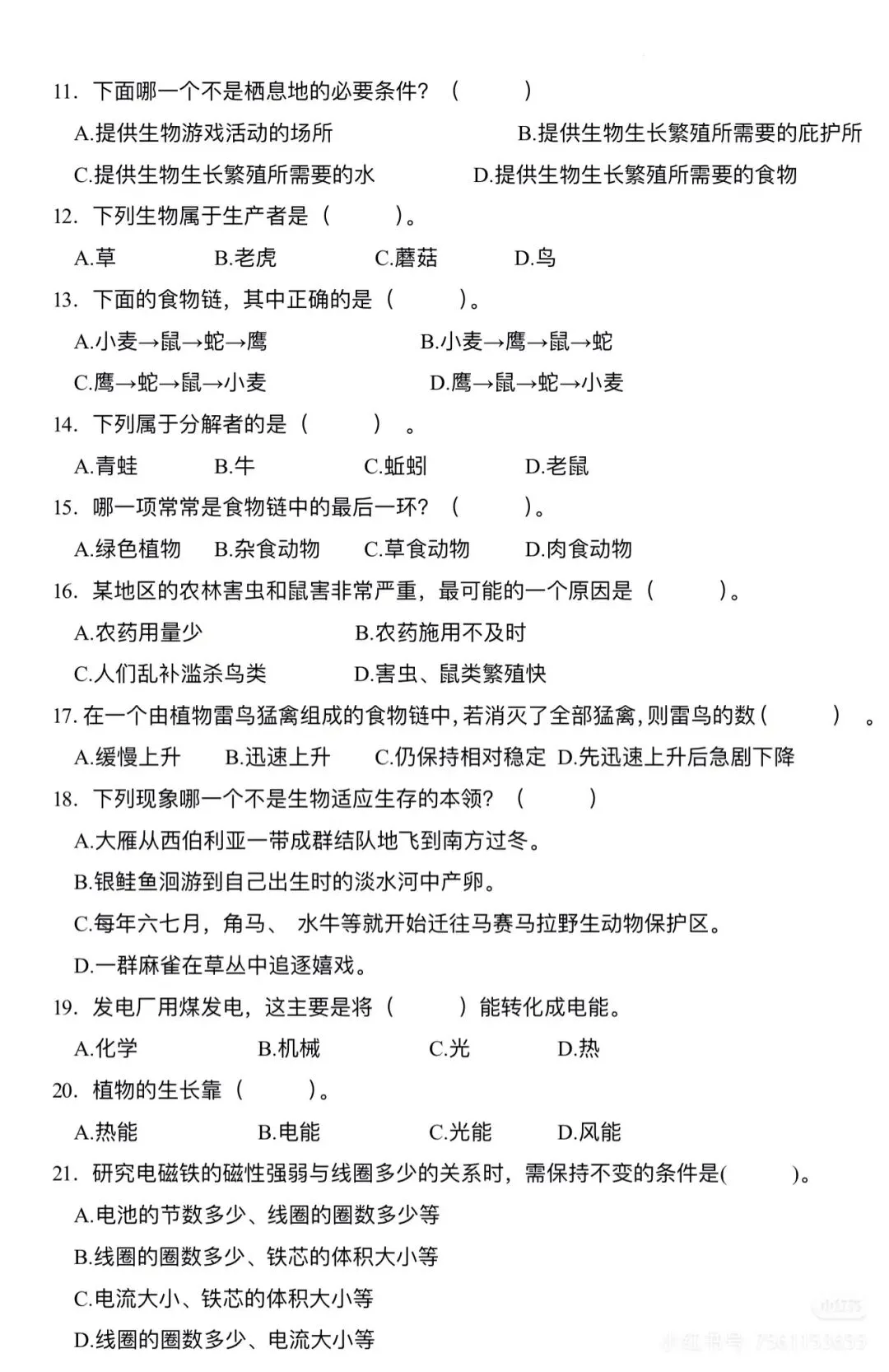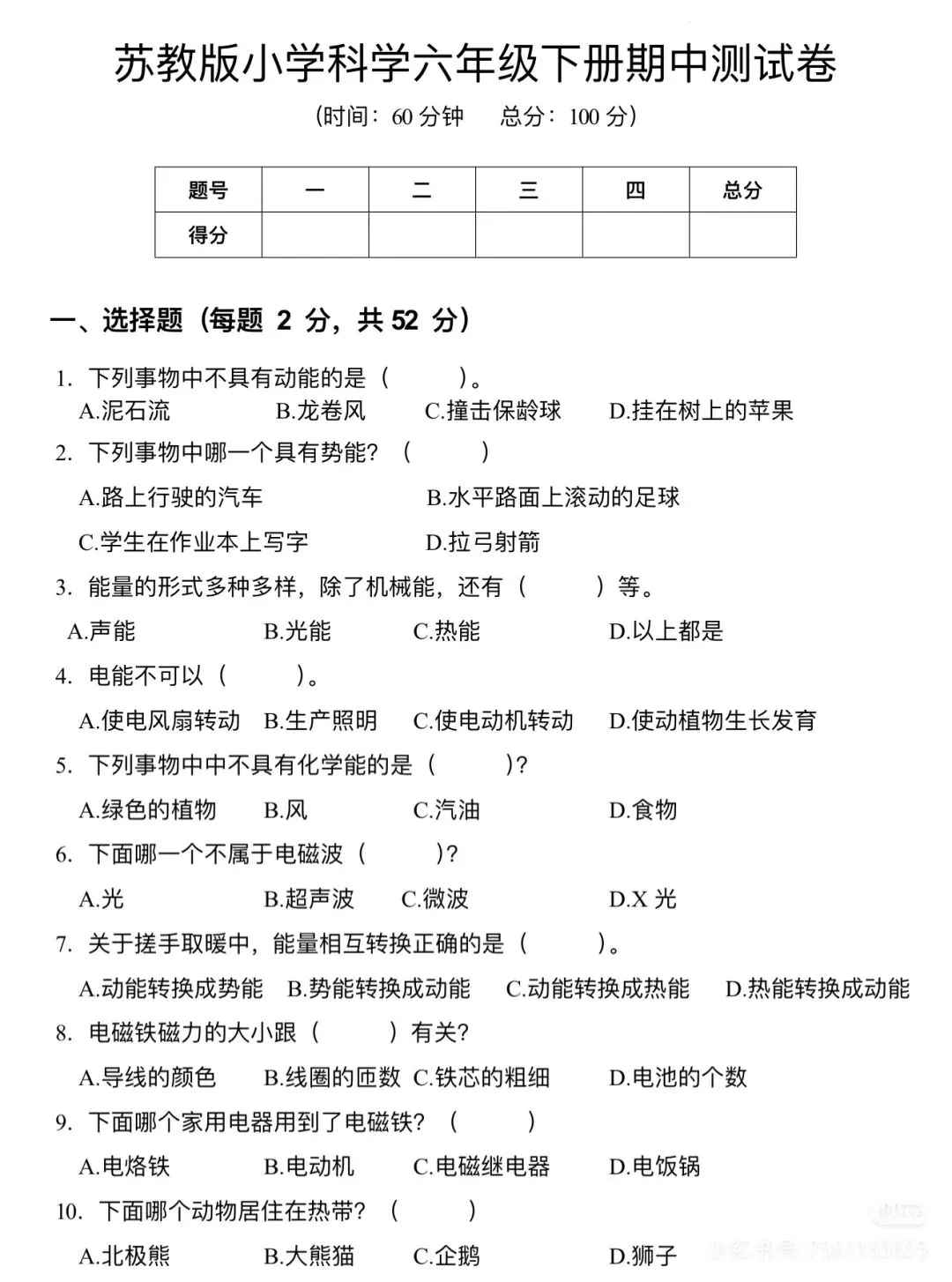 >六下科学期中考试卷 苏教版免费下载