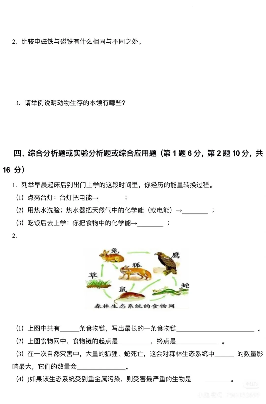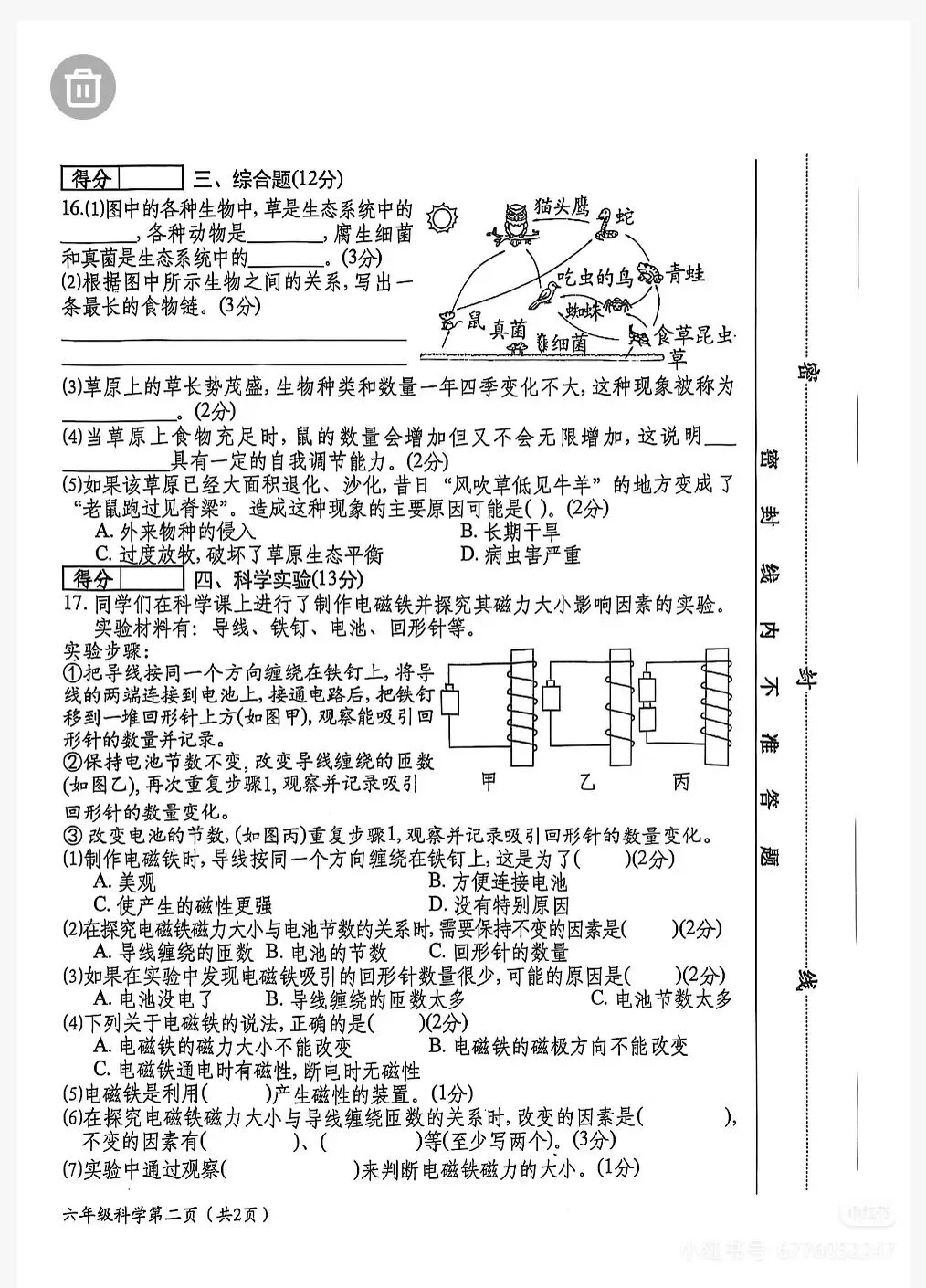 六下科学期中考试卷 苏教版免费下载