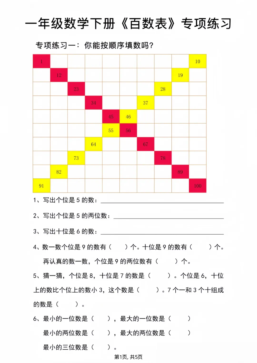 【免费下载】一年级(下)数学 《百数表》专项练习,可打印,PDF电子版