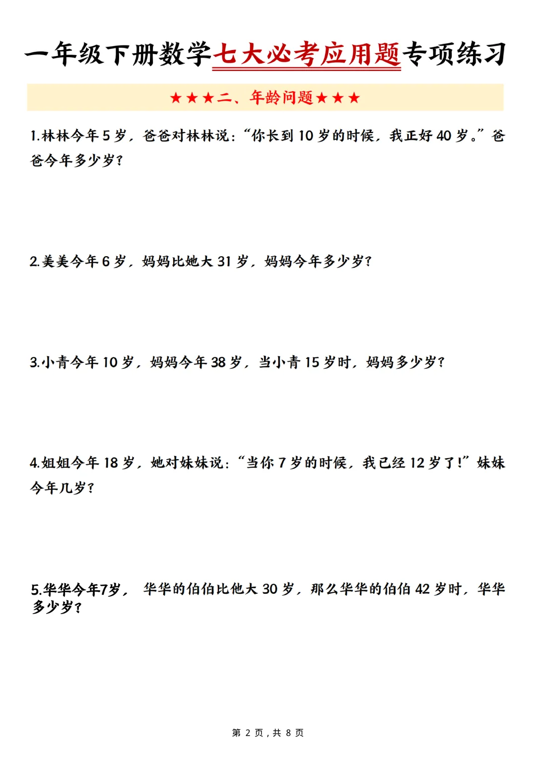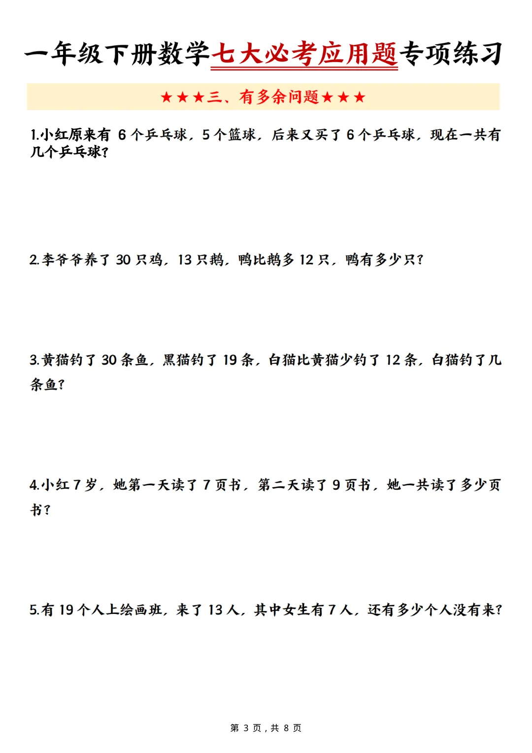 【免费下载】一年级(下)数学 七大必考应用题专项练习,可打印,PDF电子版