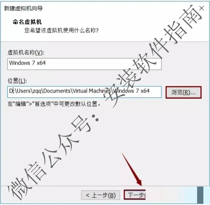 8. 点“浏览”设置虚拟机存放的位置,(建议用户选择到C盘以外的其它盘),点“下一步”。