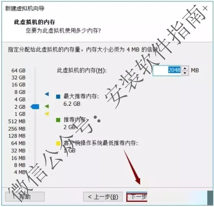 11. 设置虚拟机的内存大小,建议最少选择512M。我这里选择2048,点“下一步”。