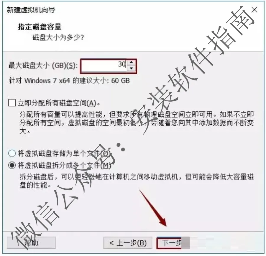 16. 选择磁盘容量大小(xp系统建议设置10G以上。Win7及以上系统设置30G以上)点“下一步”。
