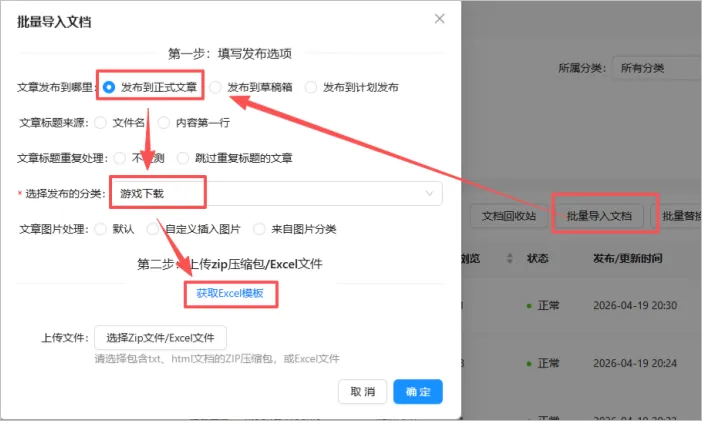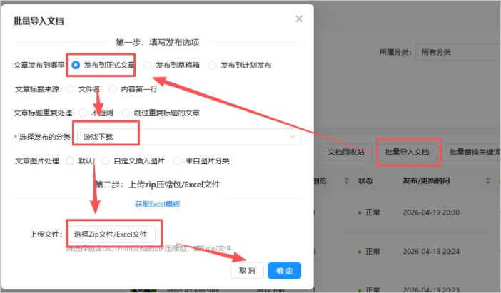 网站后台--文档列表--批量导入文档--选择文章发布到哪里--选择发布的分类,如图: