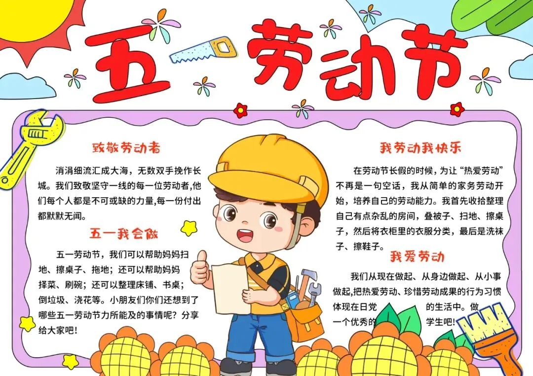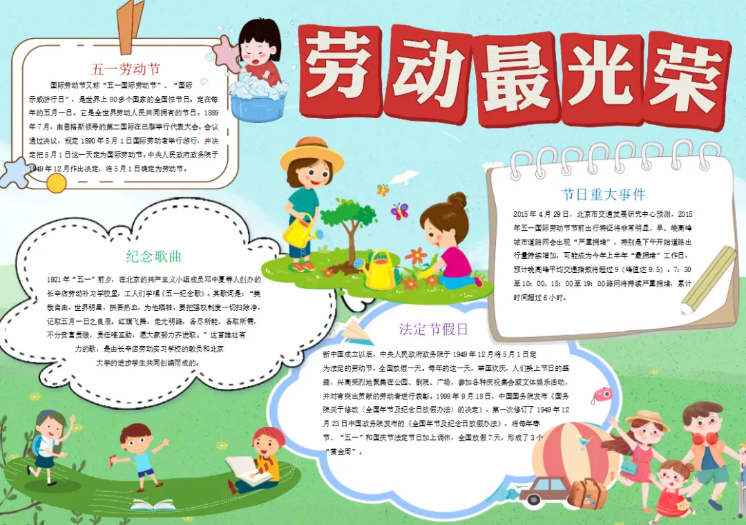 彩色卡通手绘51劳动节小报手抄报小学生手抄报五一劳动节