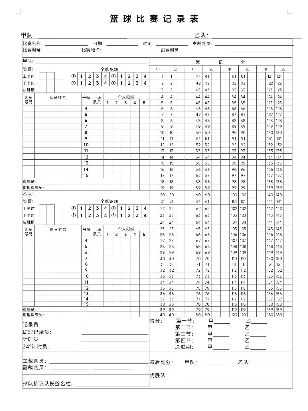 篮球比赛记录表上下半时.doc