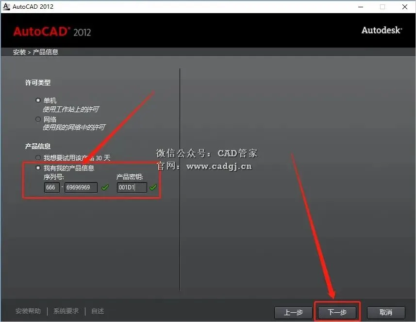 8.输入序列号:666-69696969,密钥:001D1,输入好后点击【下一步】。
