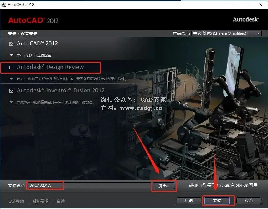 (注意:这里第二项Autodesk@ Design Review可以选择安装,也可以不选,建议不要选择,否则有可能导致最后安装失败。)