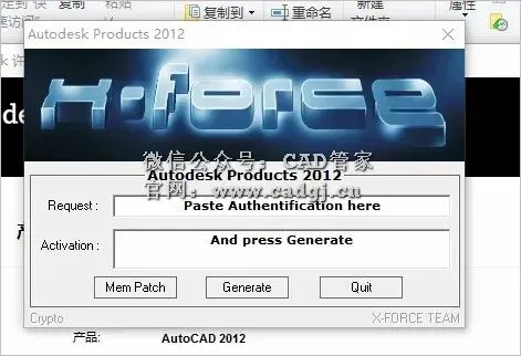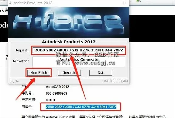 22.使用快捷键【Ctrl+C】复制申请号,然后使用快捷键【Ctrl+V】粘贴至注册机里面的Request方框中(记得删除原Request中的内容),粘贴好申请码后点击注册机左下角的【Mem Patch】。