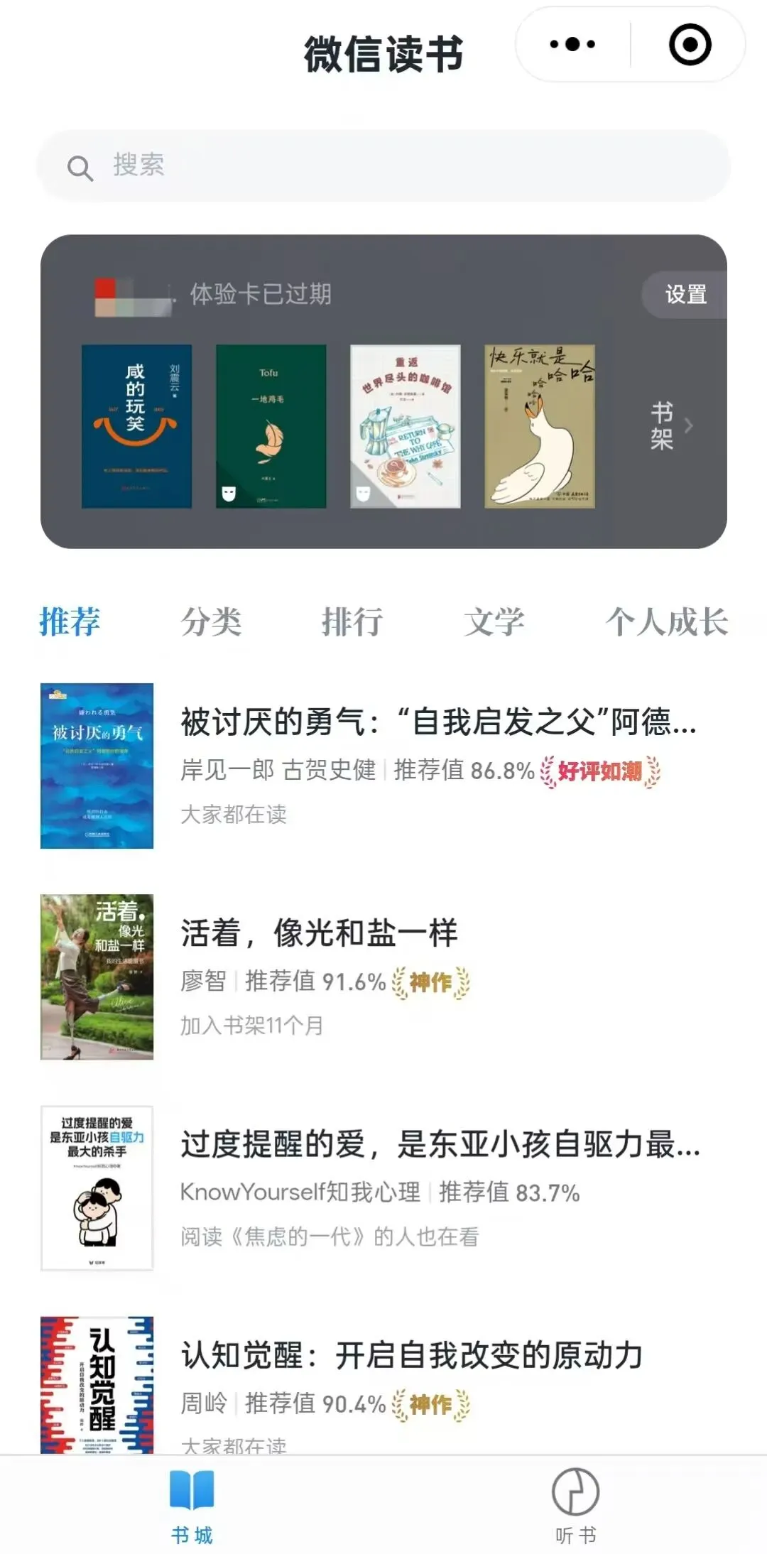 微信读书的免费部分也足够满足我的阅读需求,与“移动图书馆”形成互补。