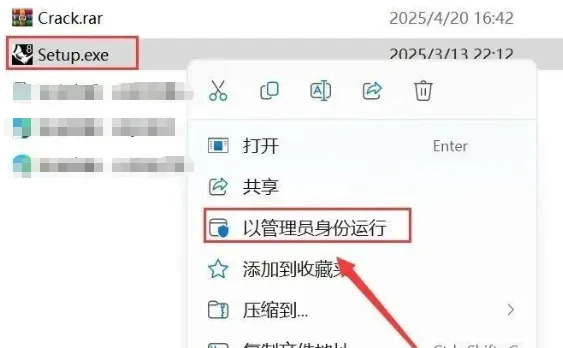 (2)进入解压后的文件夹,右键【Setup】 → 选择【以管理员身份运行】。