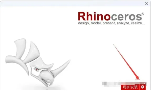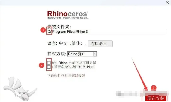 (4)安装设置:① 修改路径地址的首字母“C”,可更换安装盘符(如改成 D 表示安装到 D 盘);② 取消勾选【允许 Rhino……】和【发送匿名……】;③ 点击【现在安装】。