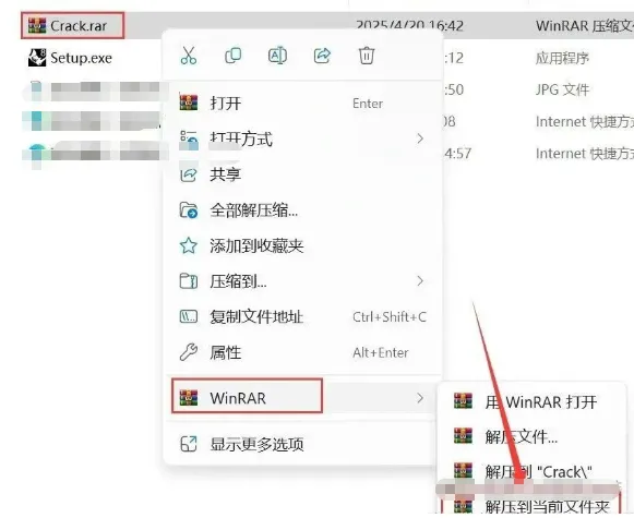 (7)返回解压目录,找到【Crack】压缩包:① 右键【Crack】 → 选择解压软件;② 点击【解压到当前文件夹】。⚠️ 注意: