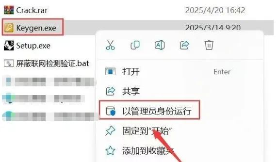 (8)在解压出的文件夹里,右键【Keygen】 → 选择【以管理员身份运行】。