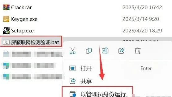(12)再次进入解压目录,右键【屏蔽联网检测验证】 → 选择【以管理员身份运行】(运行后会自动关闭)。