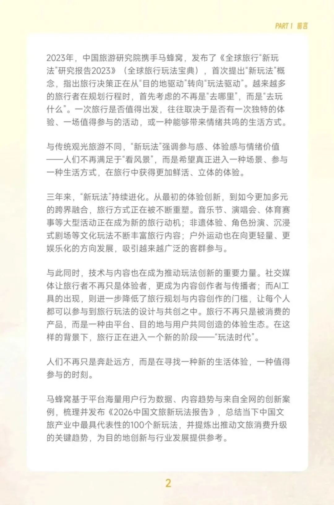 2023年,中国旅游研究院携手马蜂窝,发布了《全球旅行"新玩法"研究报告2023》(全球旅行玩法宝典),首次提出"新玩法概念,指出旅行决策正在从"目的地驱动"转向"玩法驱动"。越来越多的旅行者在规划行程时,首先考虑的不再是"去哪里",而是"去玩什么"。一次旅行是否值得出发,往往取决于是否有一次独特的体验、一场值得参与的活动,或一种能够带来情绪共鸣的生活方式。