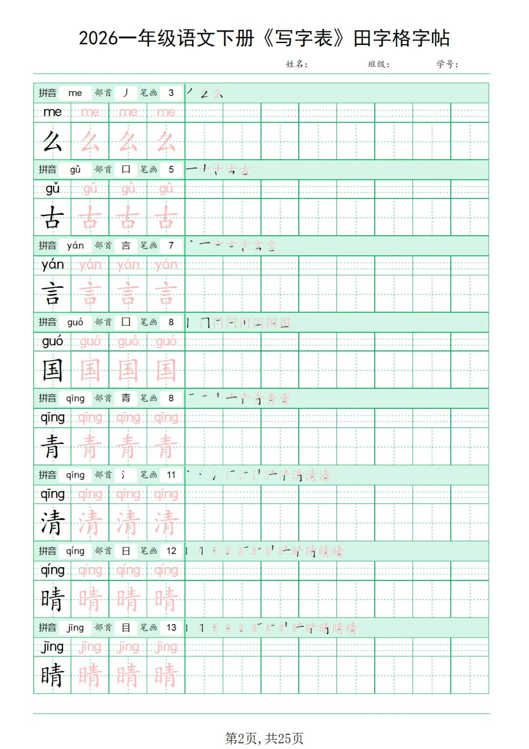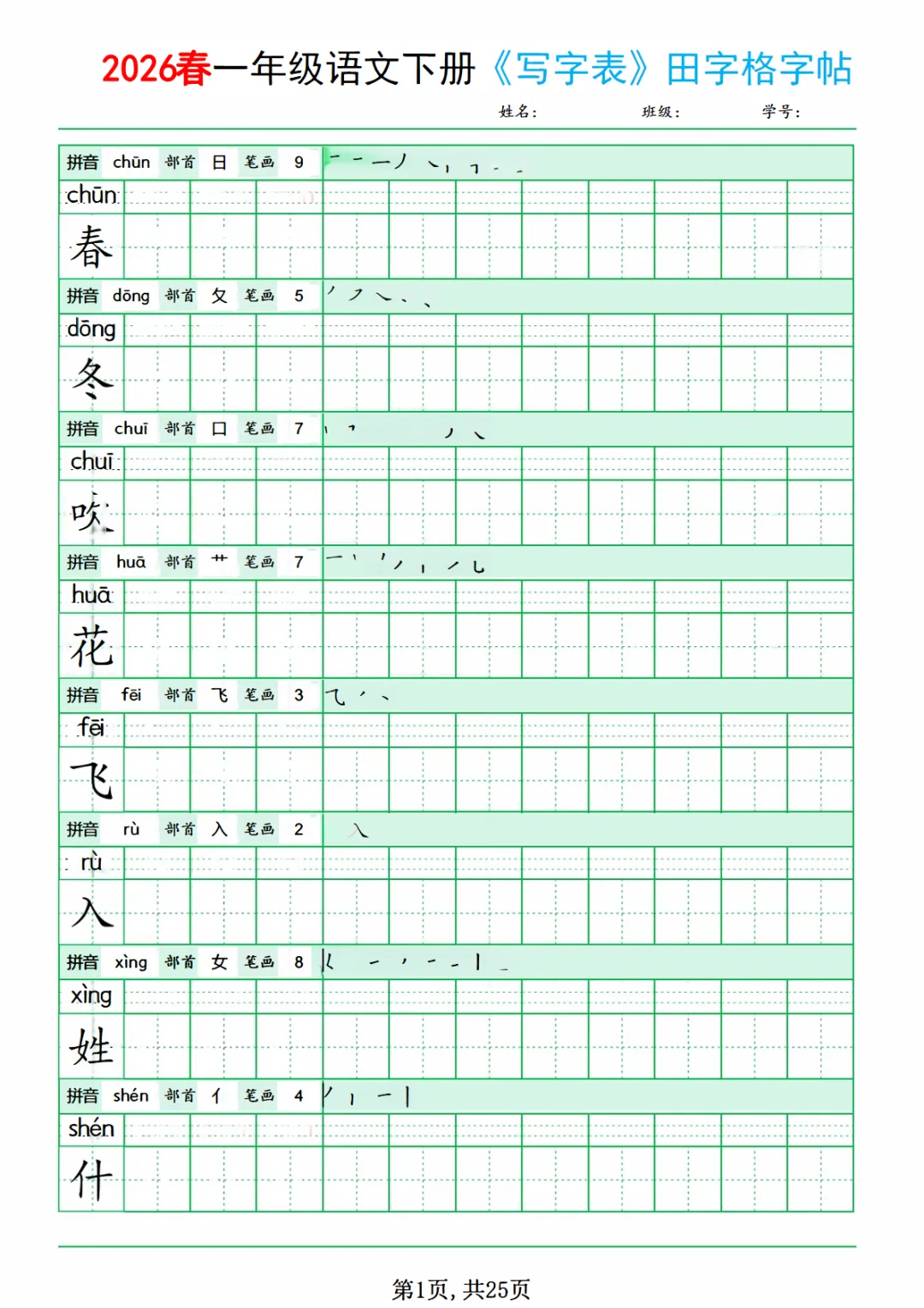 一年级(下)语文 《写字表田字格字帖》拼音+部首+笔画+笔顺
