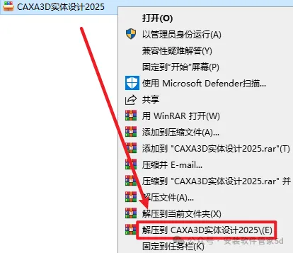 1.选中下载的压缩包,然后右键选择 “解压到CAXA3D2025 SP0”
