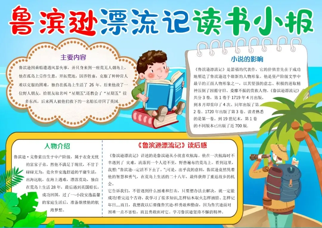 蓝色卡通鲁宾逊漂流记读书小报手抄报读书分享鲁滨逊漂流记