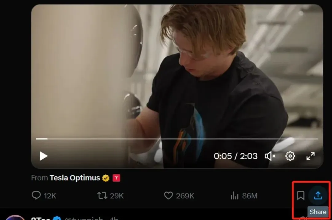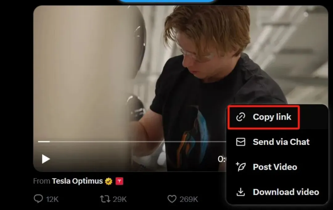 第一步复制链接,在 X(原推特)中找到目标视频,通过分享按钮复制推文链接;