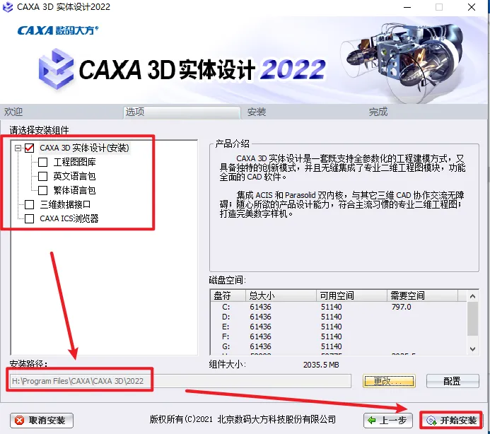 4.选择勾选“需要安装的组件”,选择软件的安装路径,安装路径不要出现中文,点击“开始安装”