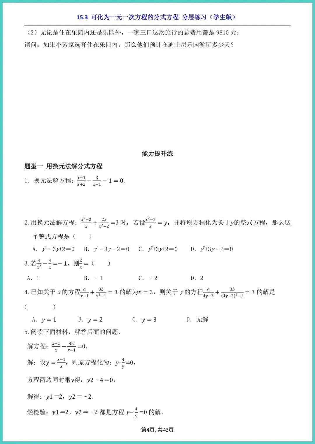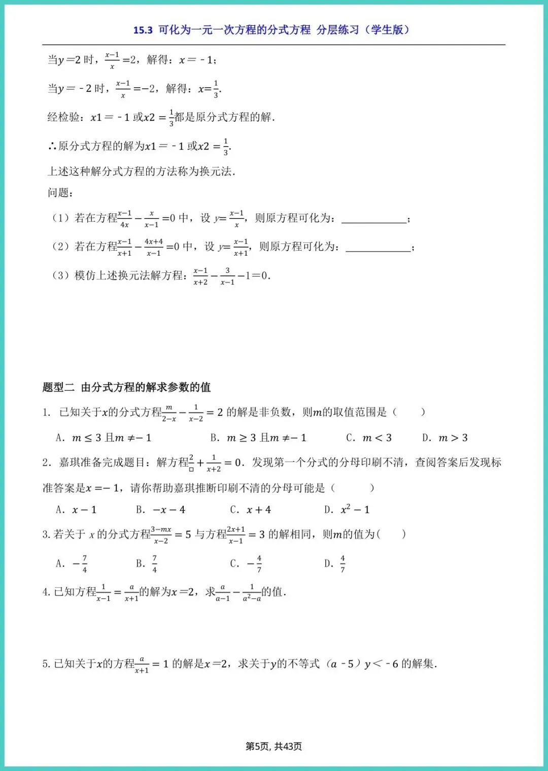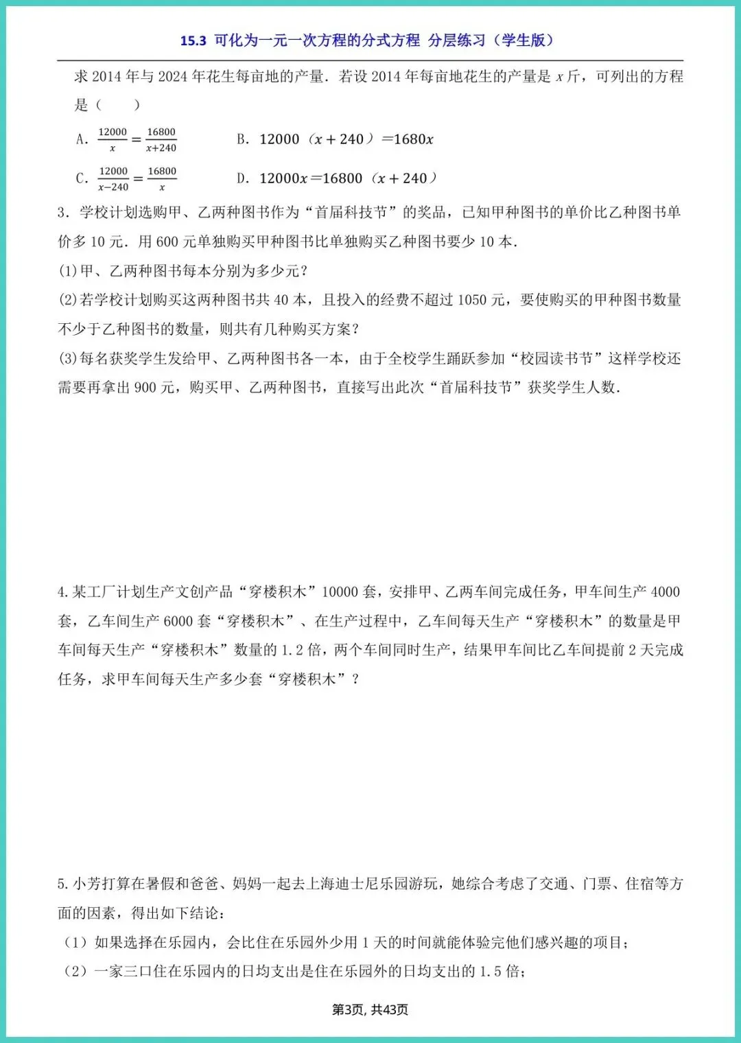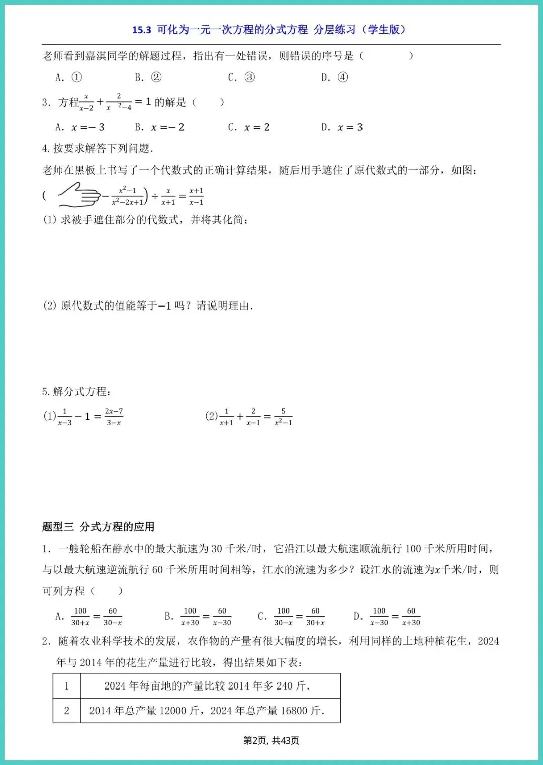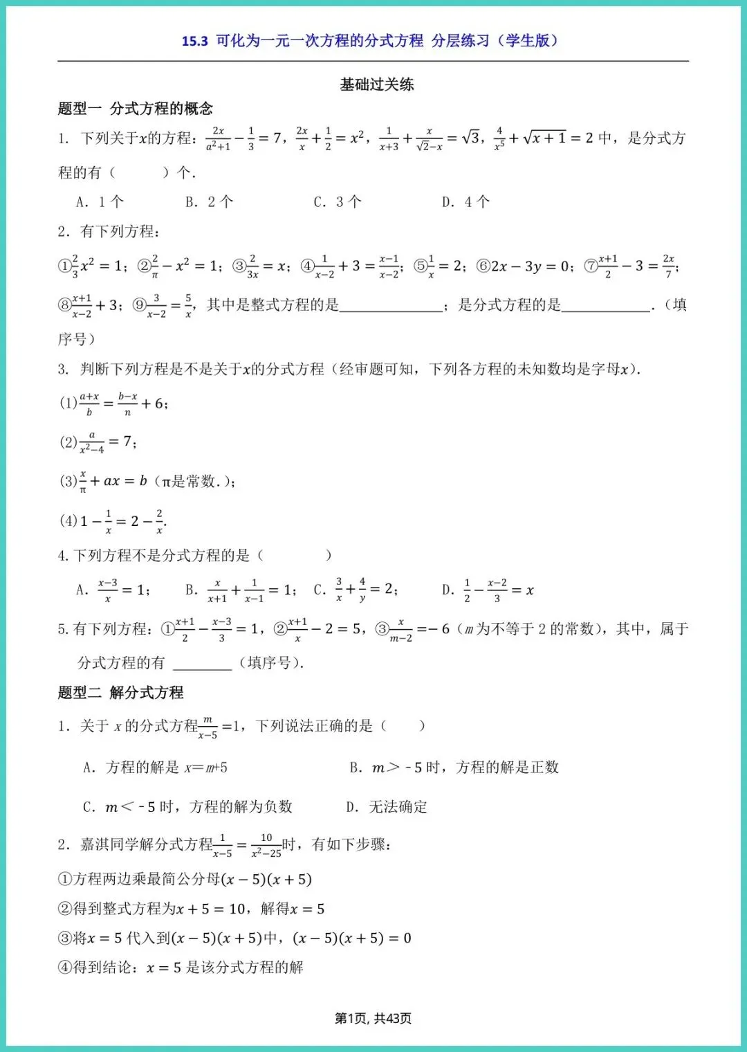 24春华东师大版八年级下册数学《15.3 可化为一元一次方程的分式方程》分层练习册,43页干货电子版新鲜出炉!基础闯关能力提升压轴拓展三阶设计,典型例题、易错警示、中考链接一个不少,步步拆解“去分母—检验—建模”套路,让孩子告别丢分黑洞,轻松把分式方程变成送分题!想趁周末弯道超车?家长赶紧打印,娃刷完这套,考试稳拿满分!