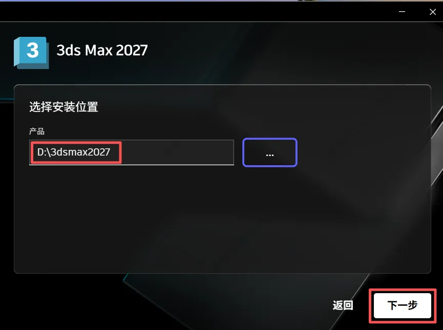 6、修改安装地址,选择需要将软件安装的磁盘(如:D盘),新建一个【3ds Max2027】并选中,点击下一步
