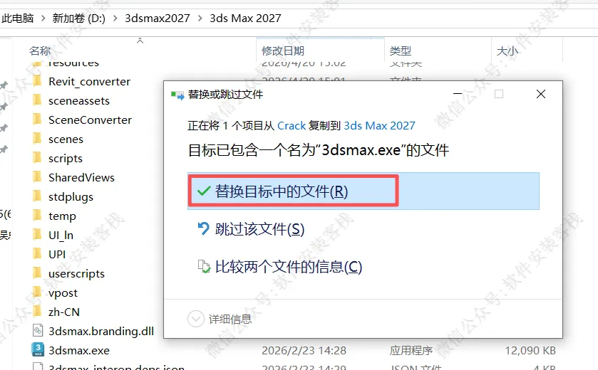 13、把上面复制的【3dsmax】文件粘贴进去点击替换目标文件