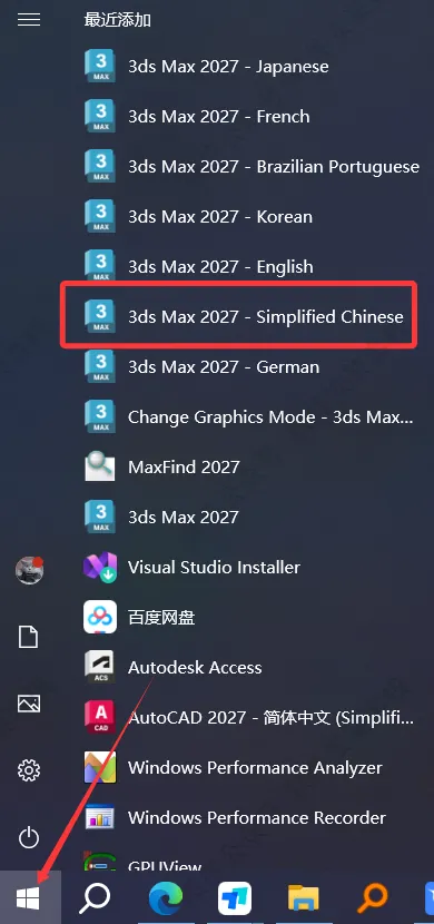 14、创建桌面快捷方式(简体中文的):点击桌面任务栏中的【开始图标】>点击【所有应用】>双击展开【Autodesk】文件夹,将【3ds Max 2027- Simplified Chinese】图标拖到电脑桌面