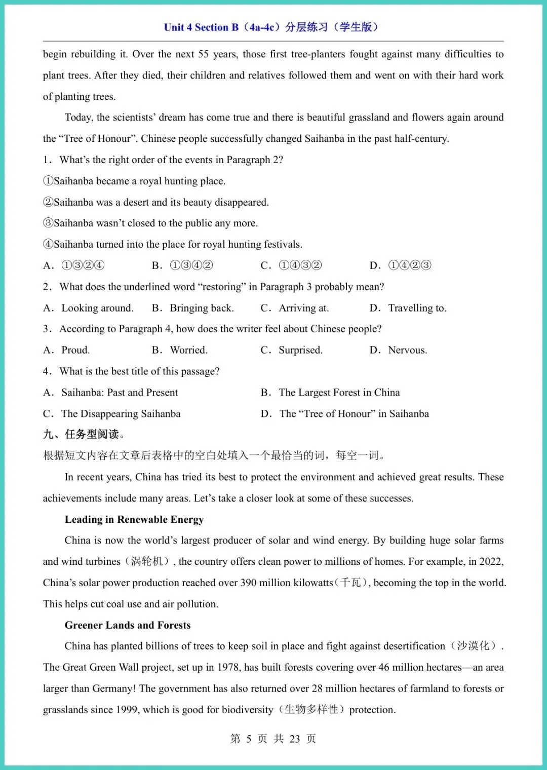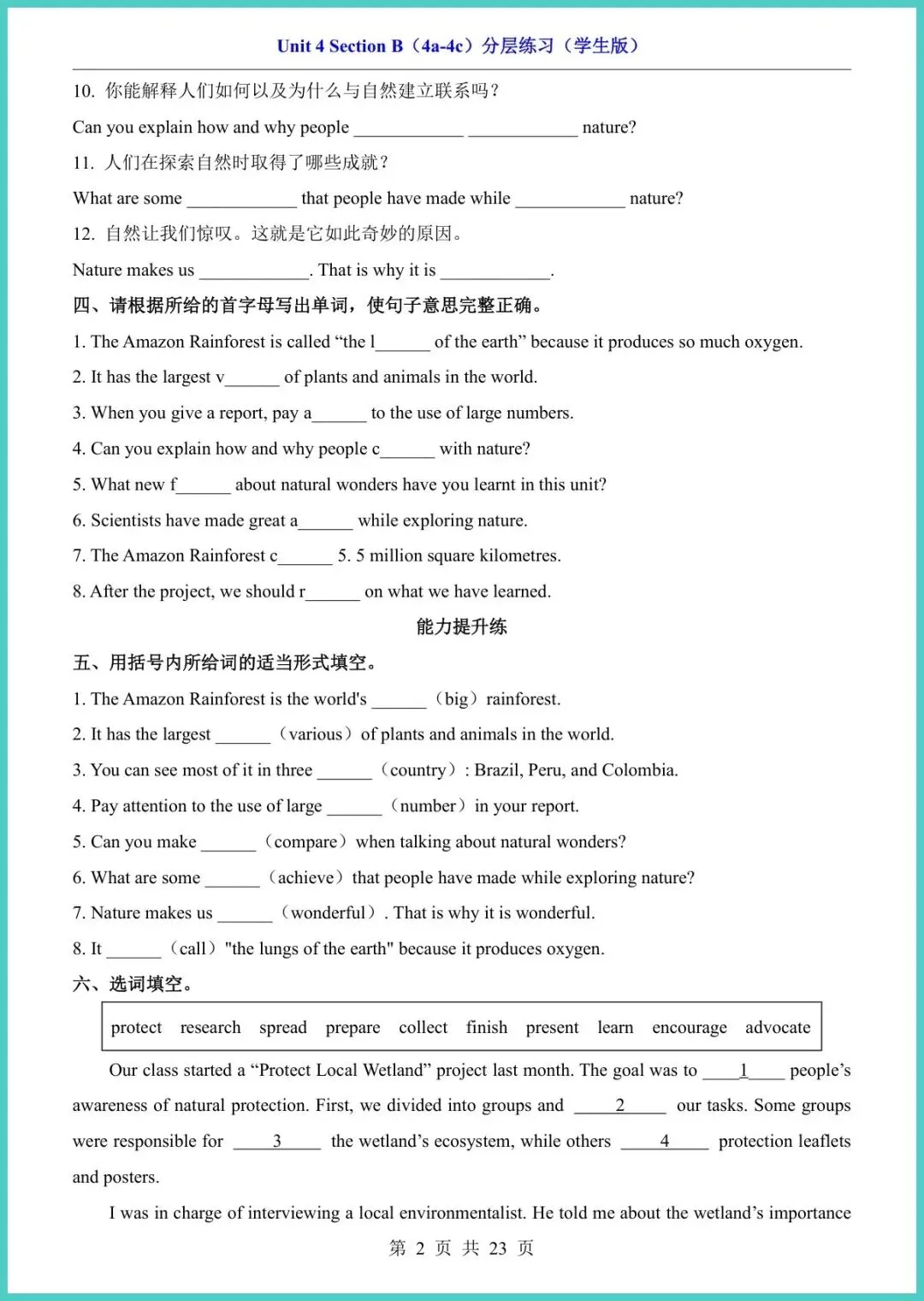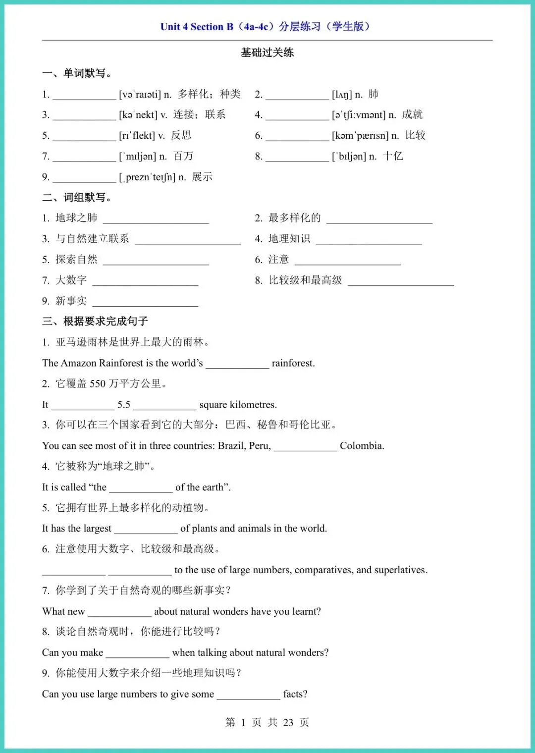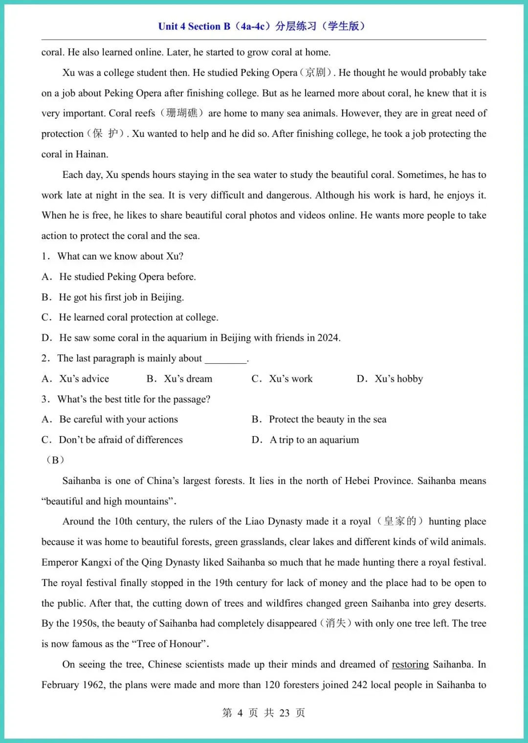 26年春人教版八年级下册英语Unit4 Section B(4a-4c)分层练习,整整23页干货,电子版直接打印!这套练习把词汇、句型、阅读、写作按基础—提升—冲刺三阶切好,孩子先做4a词汇填空打牢地基,再用4b阅读策略提速抓关键,最后4c写作模板句型升级,一条龙扶稳单元重难点。每题配答案与思路点拨,家长陪读不抓瞎,孩子自练也能秒懂错因。期末想守住阅读写作大分,这份分层练就是提分小马达!需要的家长快打印,今晚就能练起来!
