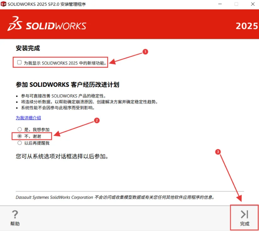 22、安装完成,取消勾选【为我显示.....】,勾选【不,谢谢】,点完成