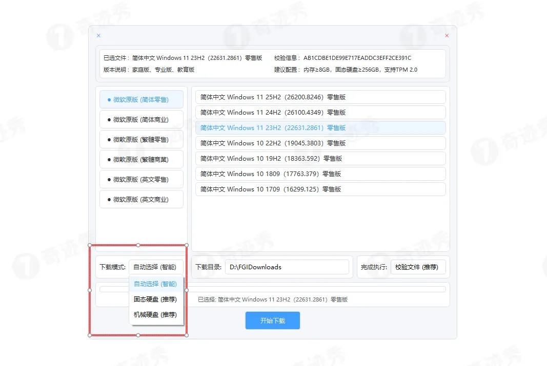 下载操作极其简单,可选择固态硬盘或机械硬盘作为存储位置,默认情况下会自动匹配合适的硬盘。下载前只需选定保存目录,点击「开始下载」即可,无需多余操作。