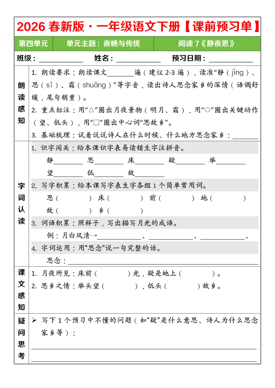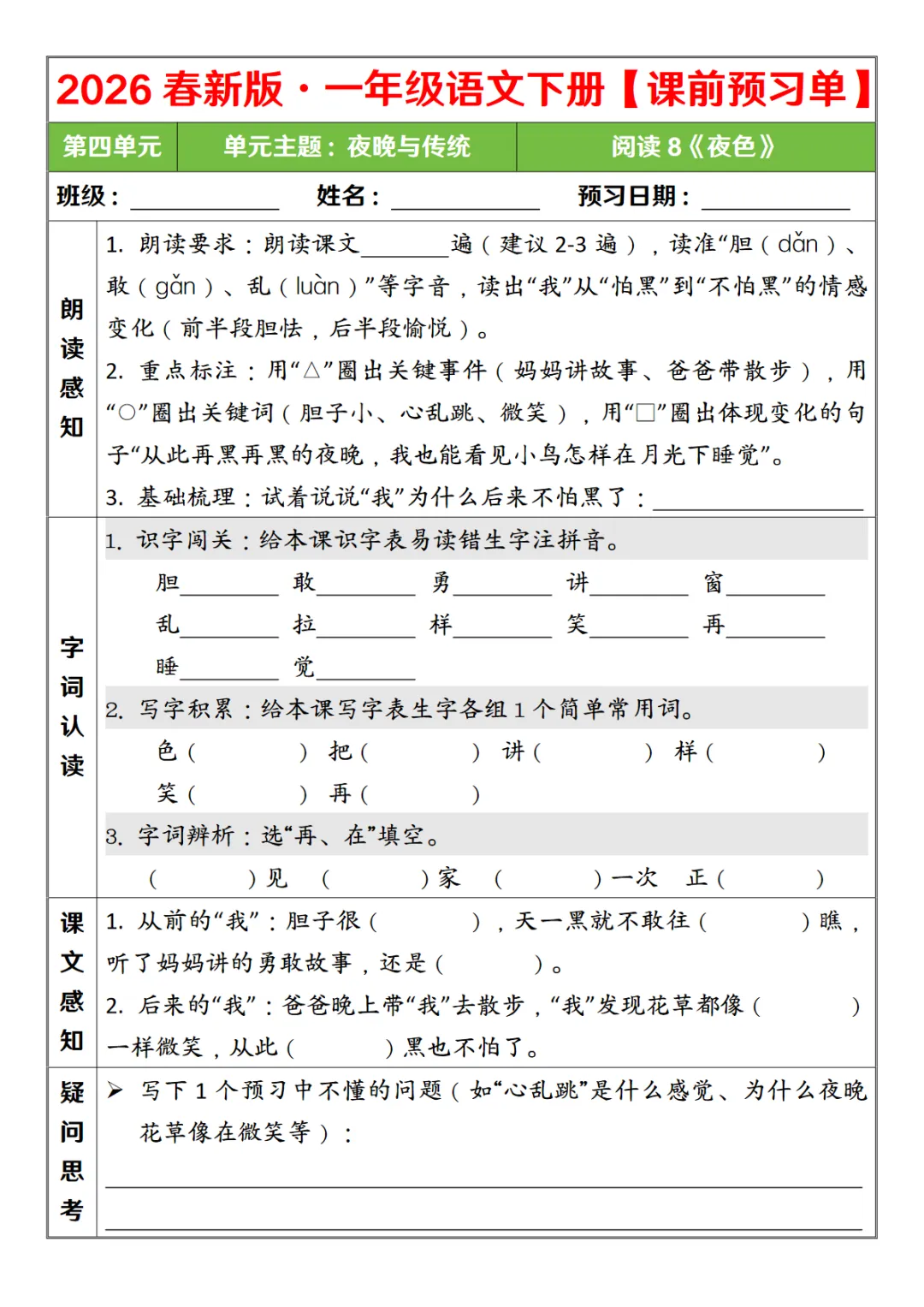 一年级(下)语文 26春第四单元课前预习单