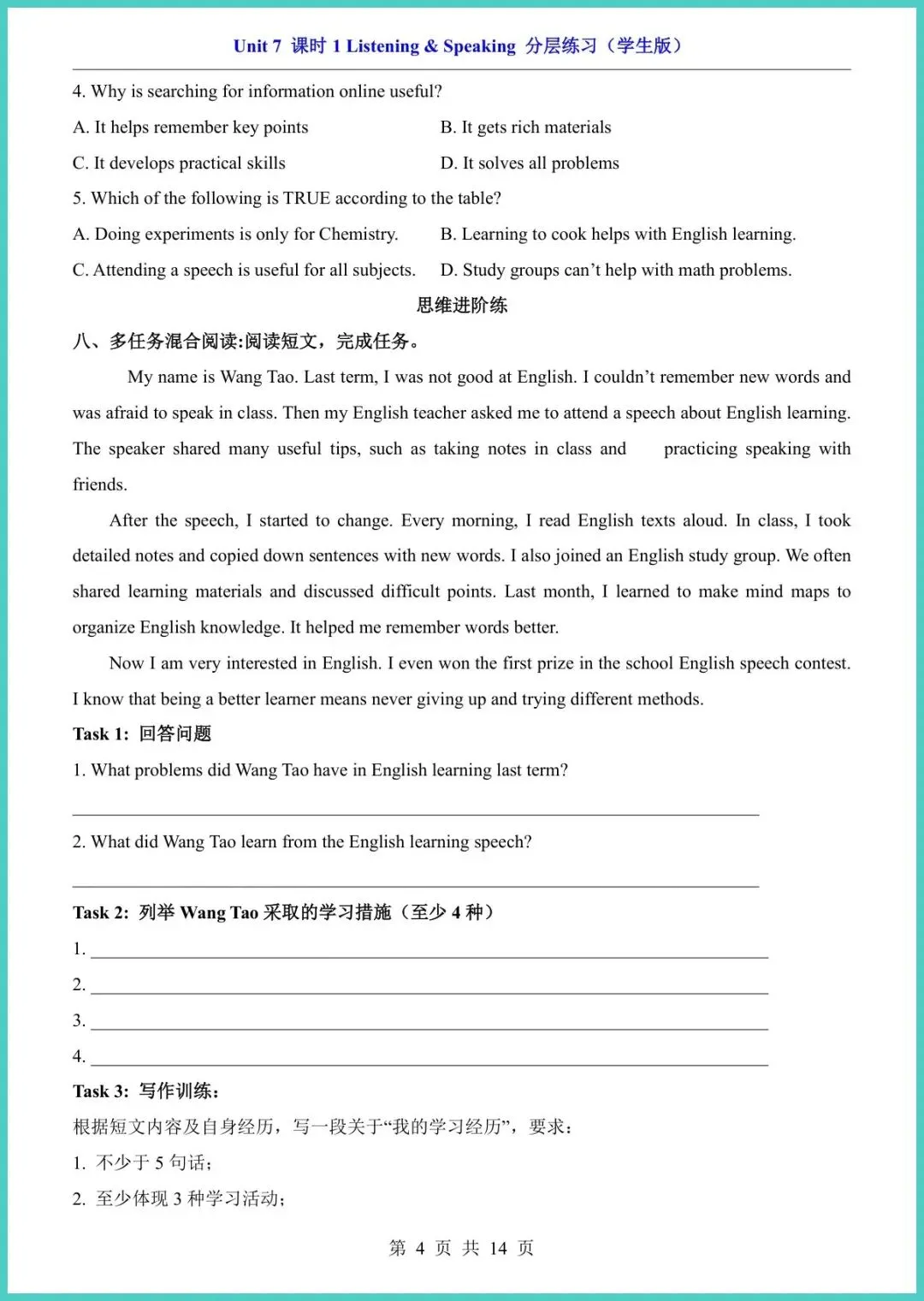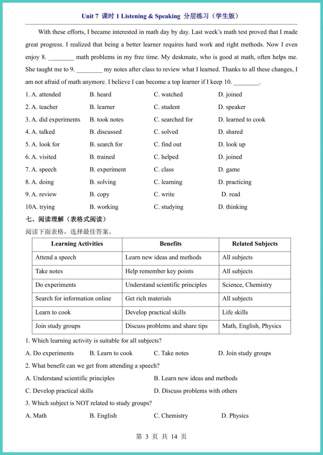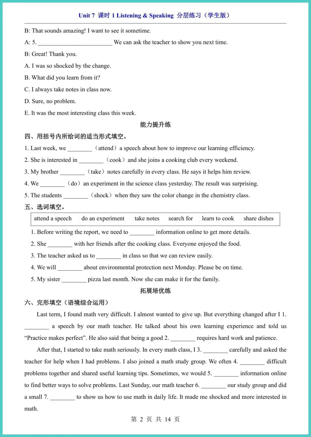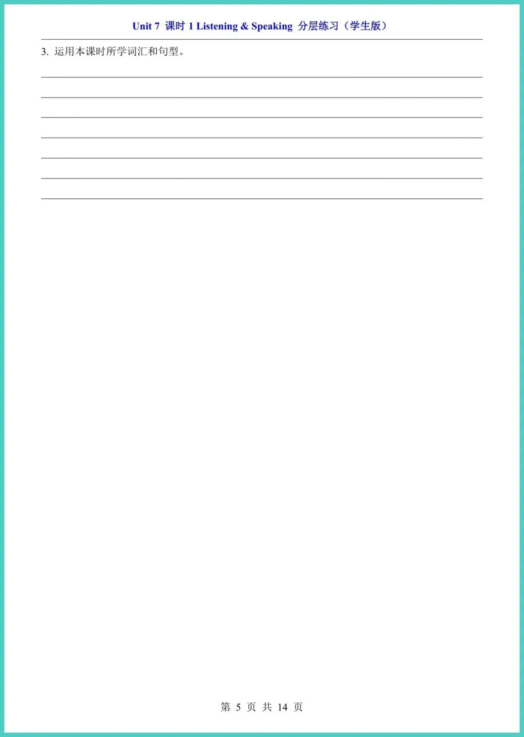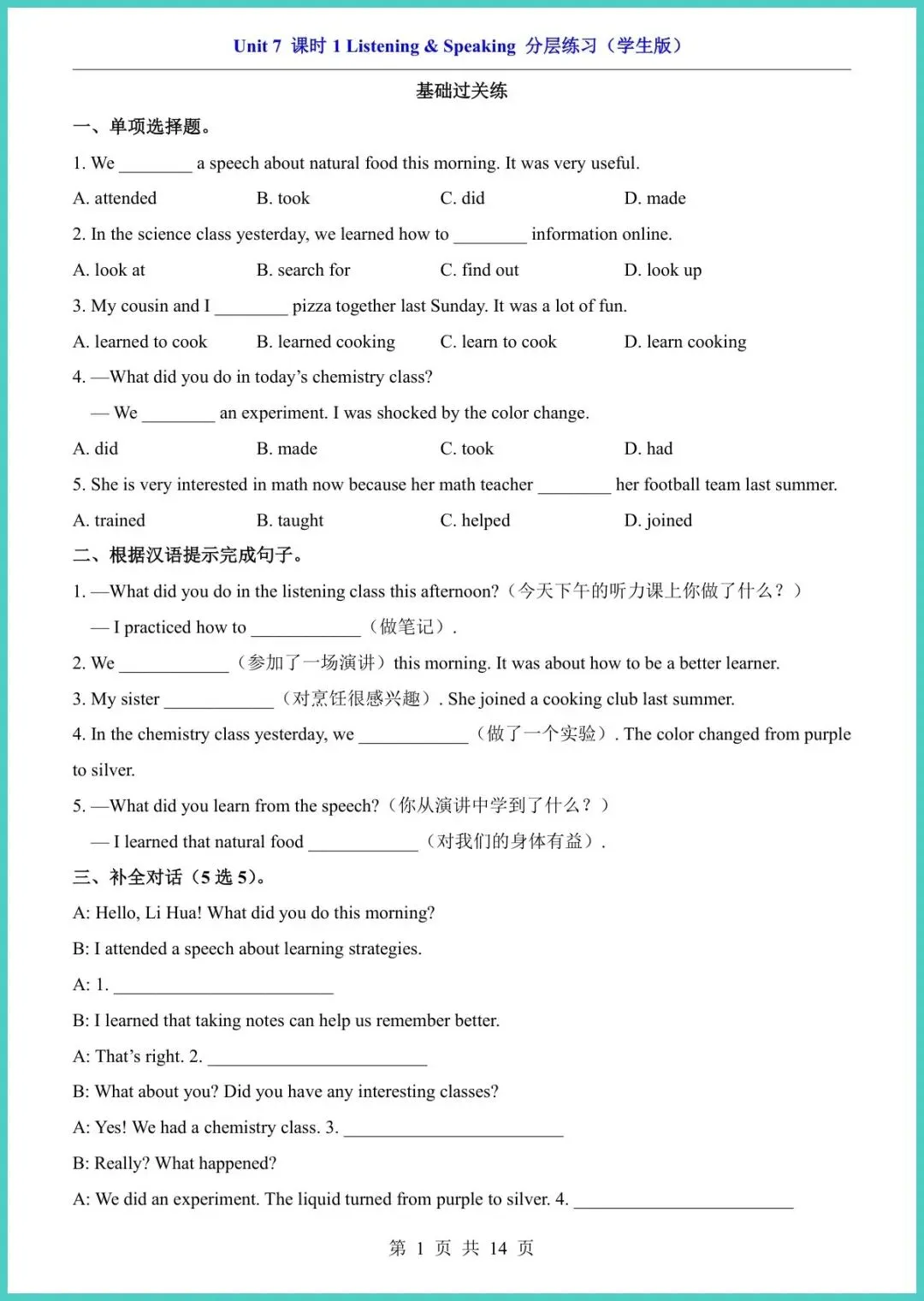 最新版八年级(下)英语Unit 7课时1分层练习(仁爱版)新鲜出炉!14页精编,专为八年级娃量身打造。内容分层设计:A组夯实词汇句型,B组强化语法阅读,C组挑战写作表达,题题紧扣课本,难度梯度清晰。每练一页,孩子就能自查盲区,老师上课提到的考点悄悄装进脑袋,成绩自然水涨船高。资料已排好版,回家就能打!需要的家长别犹豫,转发收藏,今晚就陪娃练起来!