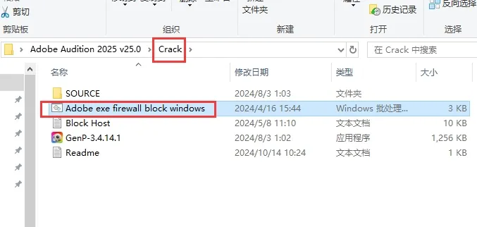 8. 打开“Crack”文件夹,双击运行“Adobe exe firewall block windows.bat”。